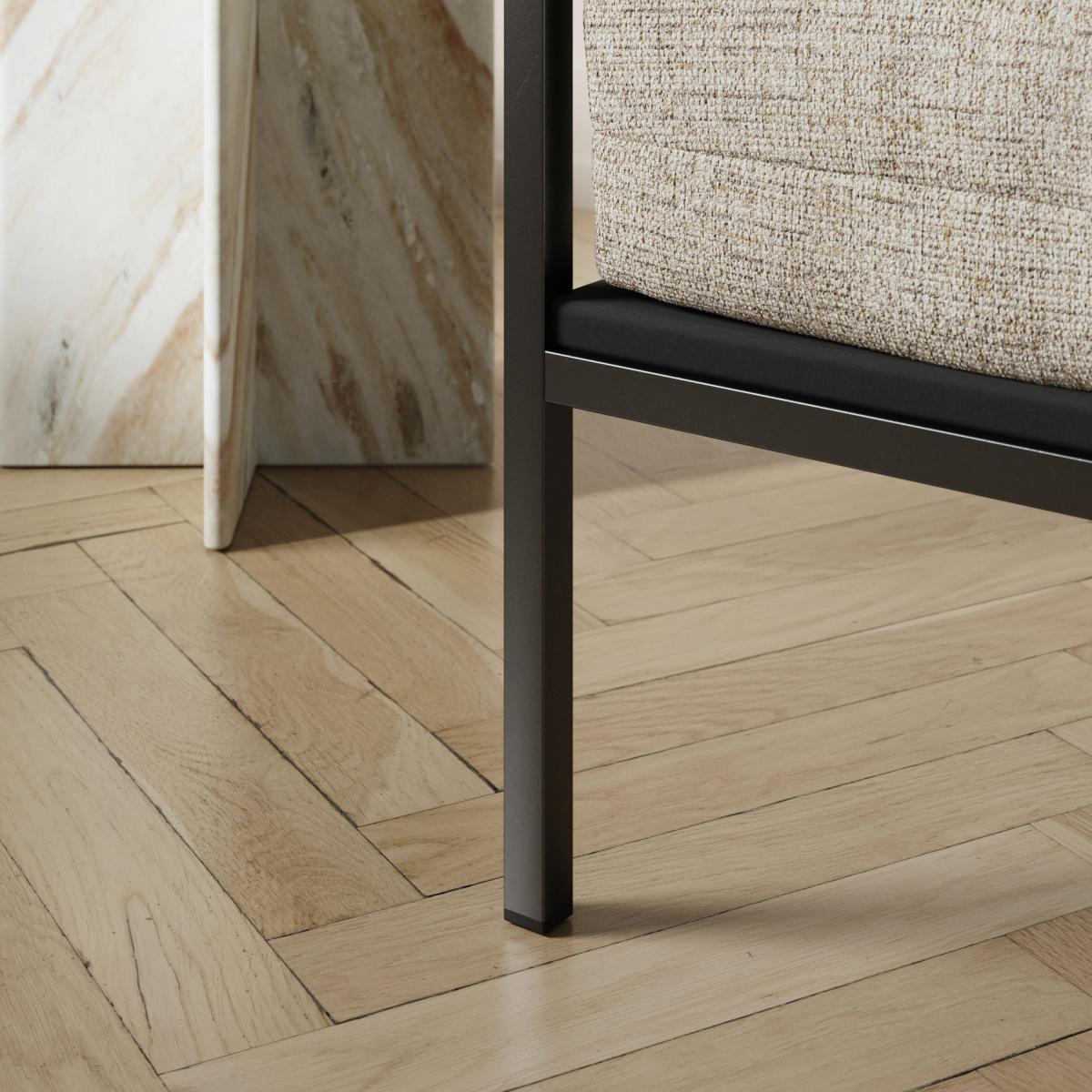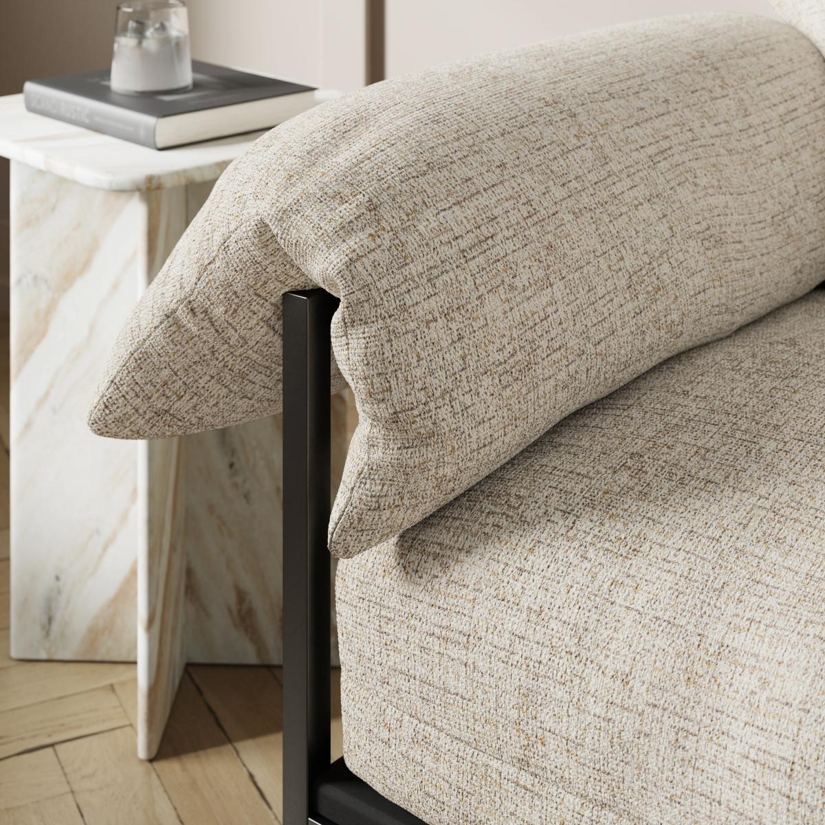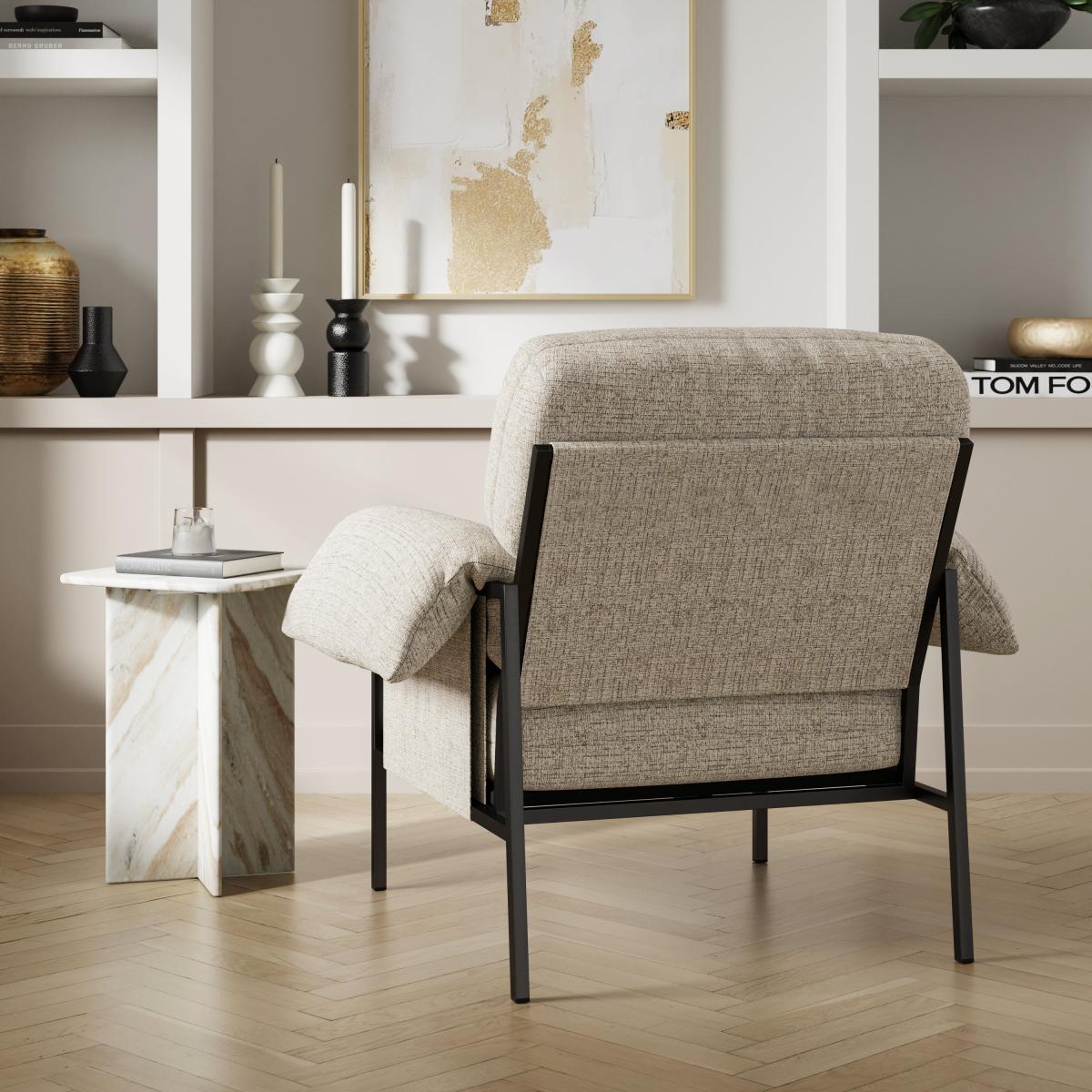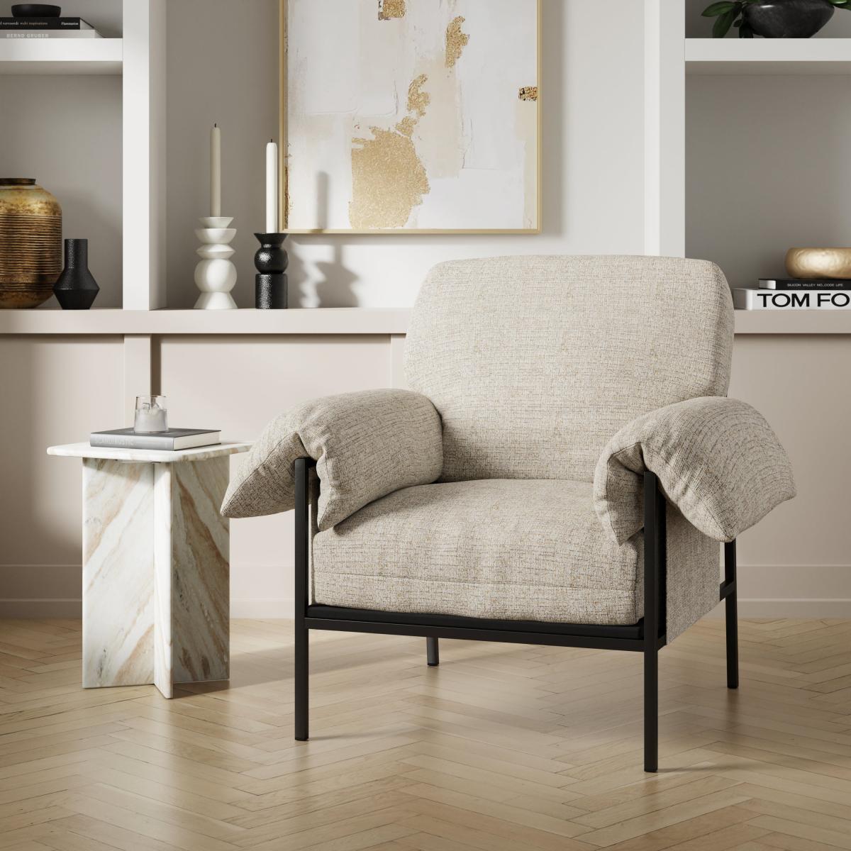 I particularly like the “Kai” occasional chair for its relaxed pillow-arm design and slender metal frame - it strikes a balance between casual comfort and contemporary lines. The woven neutral fabric means it sits just as happily in a Scandi-inspired living room as it does in an industrial loft or a pared-back study. For styling, pair the chair with a low-profile side table in marble or light wood, and layer in a textured wool throw to echo the upholstery’s subtle weave. A single sculptural vase or a small stack of art books on the armrest will sharpen the look without cluttering, while a muted rug beneath will ground the piece and tie it into the wider scheme.