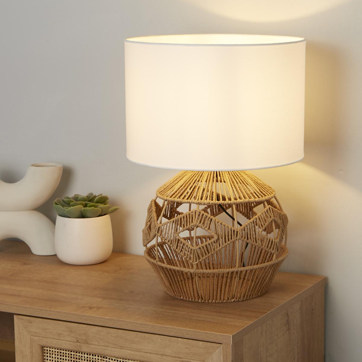 The Kai table lamp is a geometric natural woven rattan base with complementary white shade
