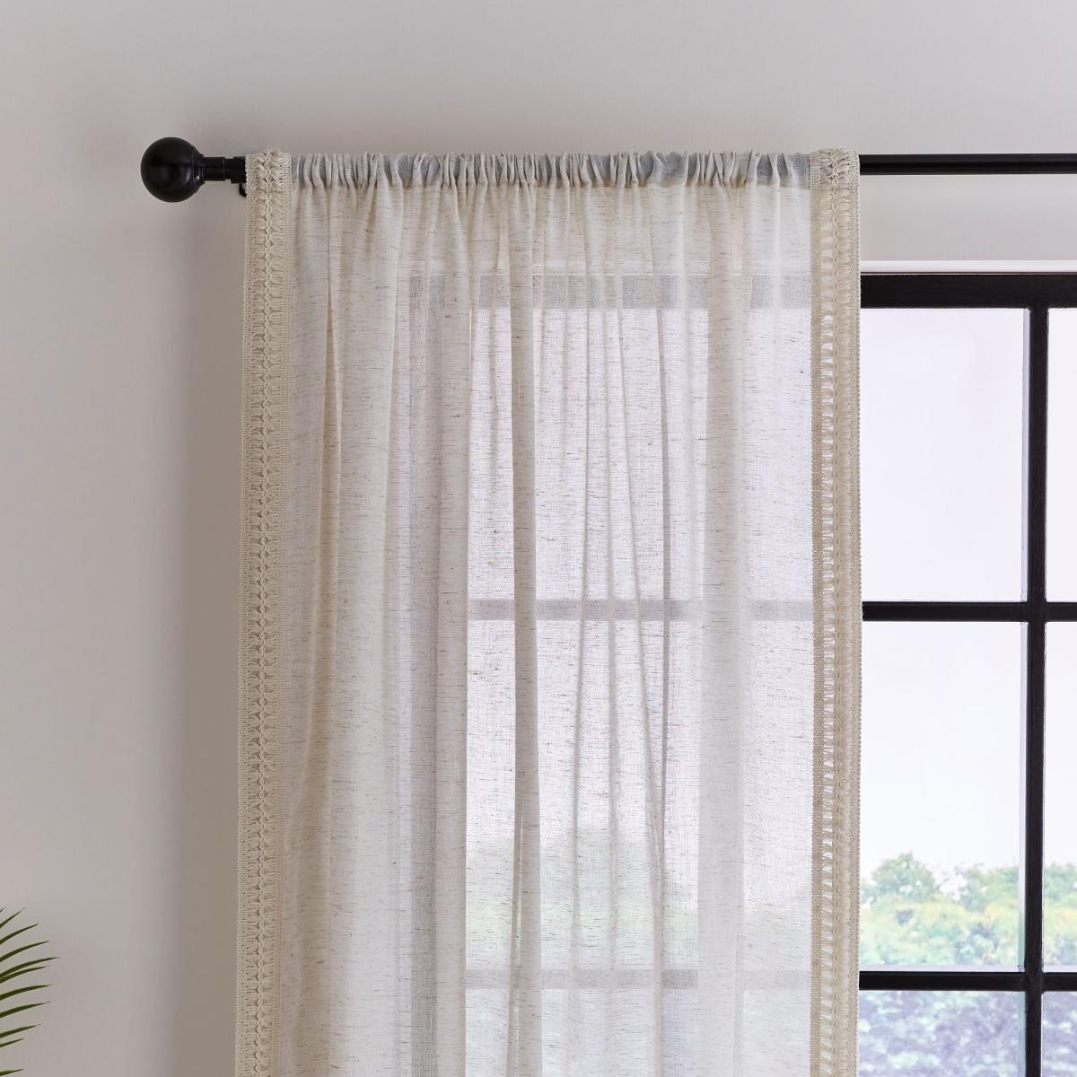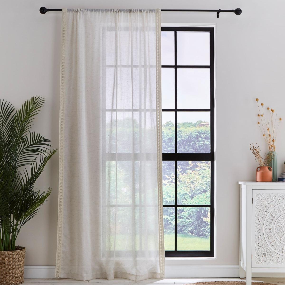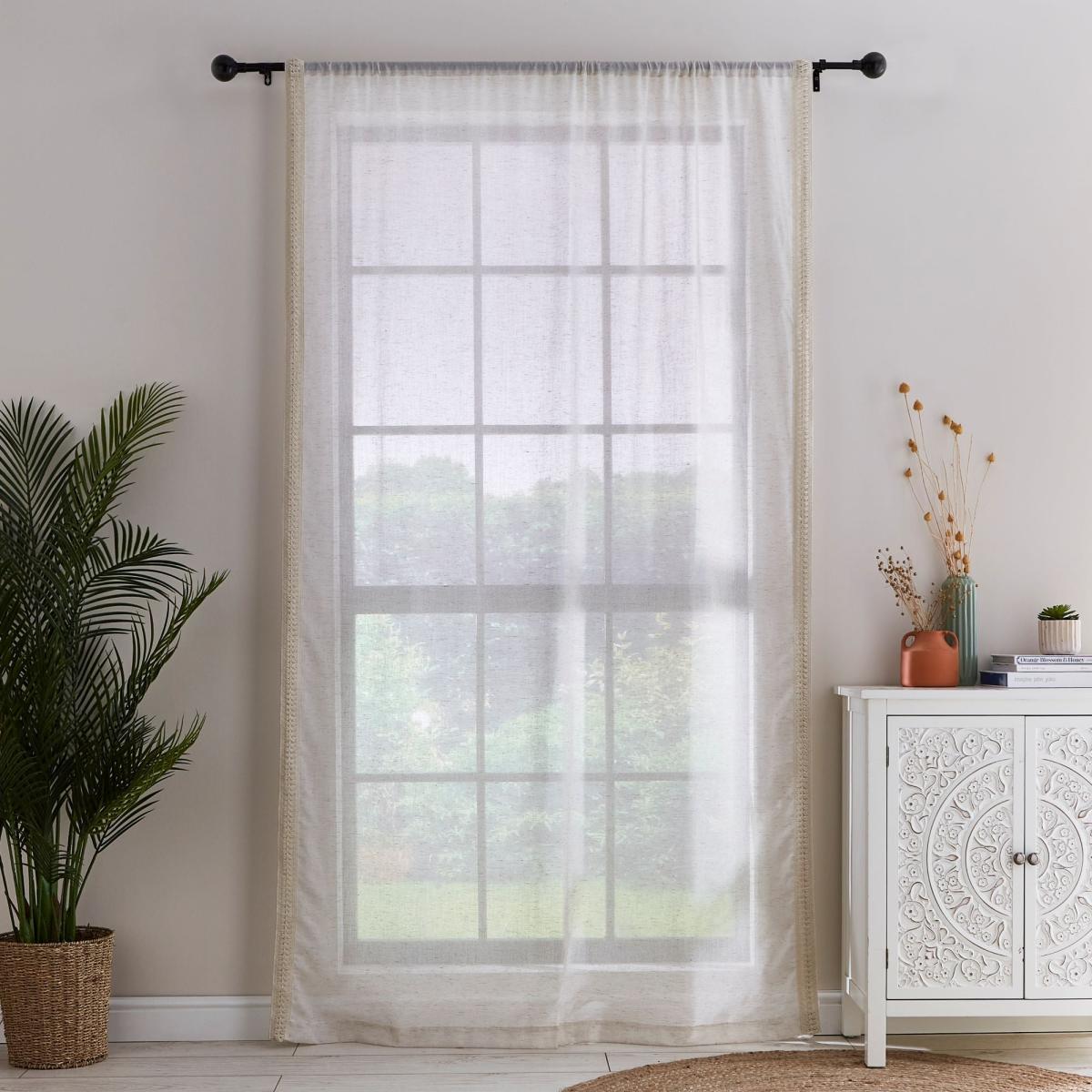 * Includes 1 x voile panel* Lace detailing* Boho style* Slot top header* Multiple sizes available Introduce a touch of boho chic into your home with our beautifully embellished Kaia voile. This panel features a delicate lace trim along both leading edges, adding a stylish flourish to any room. Crafted from a polyester and linen blend, it offers a stunning drape that adds texture and elegance. Available in four sizes with a slot top header, it's an effortless way to infuse your space with personality and charm.