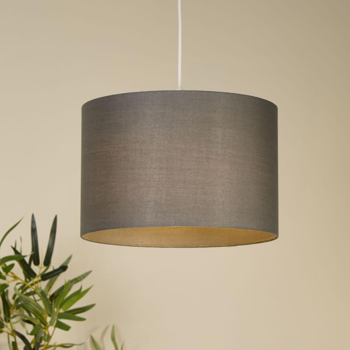 This grey lampshade features a smooth, matte finish in a medium to dark tone with a subtle warm undertone, giving it a soft and inviting look. Its cylindrical shape and clean, unadorned design make it a versatile choice for both modern and classic interiors. The lighter interior lining helps diffuse light gently, creating a warm and even glow when lit.