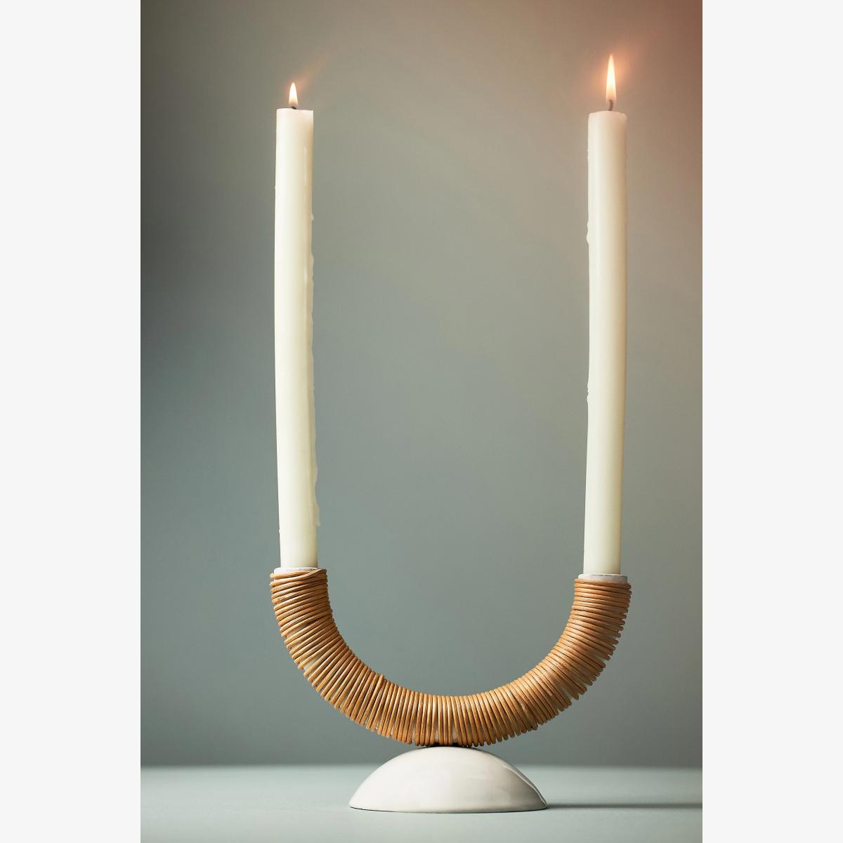 Wrapped in a rattan covering, this dual candle holder brings traditional charm to any space. * Taper candles sold separately * Aluminum, rattan * Imported