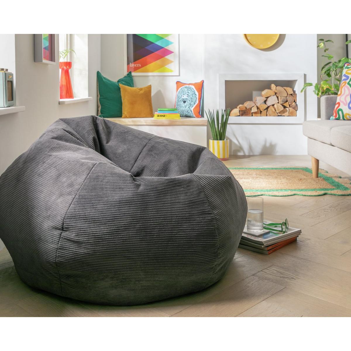 Plunge into comfort. Our big charcoal bean bag is made in a soft classic cord fabric. Lovely and snuggly Perfect to settle into for a movie marathon or during a get together with buddies. Bag yourself the comfy spot. Super versatile, beanbags are portable and the answer to instant extra seating. Made from polyester. Size H55, W70, D70cm. 5.5kg. Wipe clean. Passes UK FR regulations.