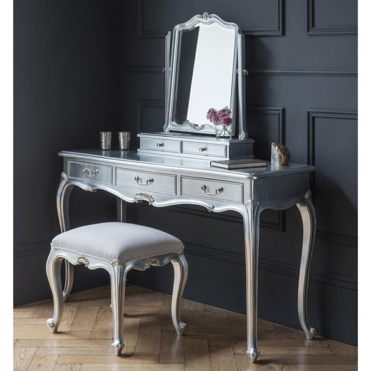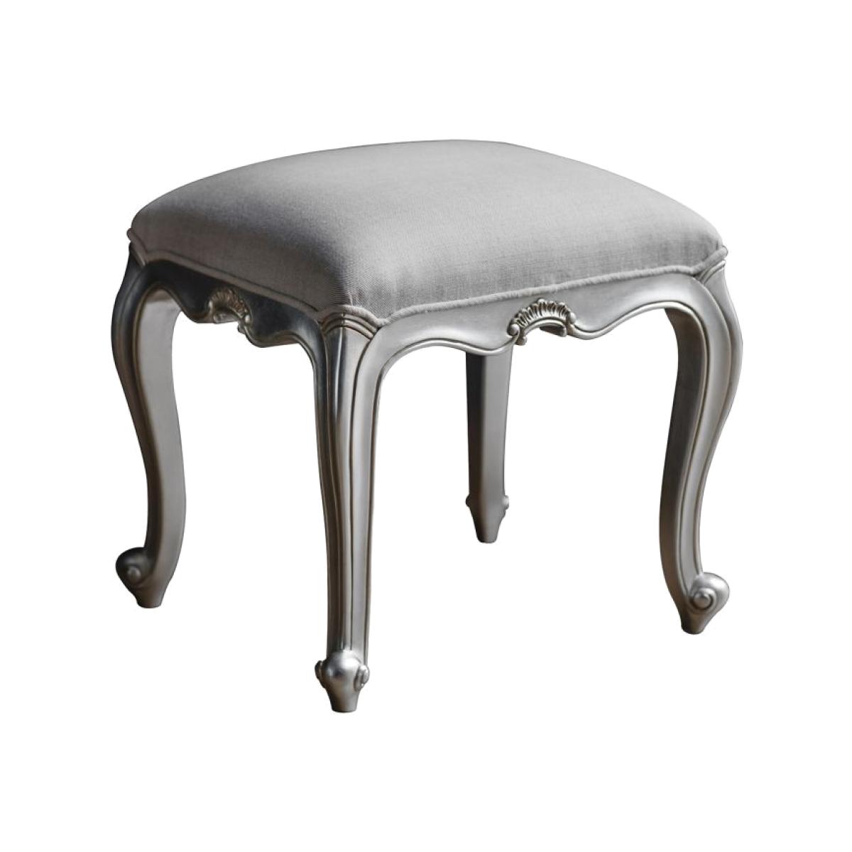 This dressing stool features a natural cotton seat pad and hand carved detailing in a silver leaf finish. A timeless classic to be enjoyed through the generations.