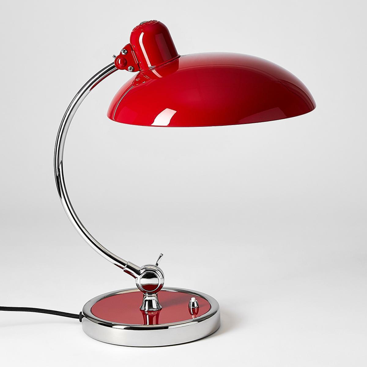Designed in 1936 by Christian Dell, the KAISER idell 6631 Luxus Table Light Red combines premium materials with precision engineering; its name 'idell' joins the designer's name with the German word for 'idea'. The 6631 Luxus Table Light is manufactured by Fritz Hansen and characterised by its slightly asymmetrical shade and world-patented, swivel ball-jointed mechanism, which makes the shade easy to adjust so you can customise the lamp's light to suit your space. A practitioner at the Bauhaus metal workshop, silversmith-turned-industrial designer Christian Dell was a metalworking expert and combined hand-polished chrome-plated brass stems with timeless hand-lacquered steel shades to create the ever-contemporary KAISER idell collection. Epitomising the Bauhaus aesthetic, the KAISER idell 6631 Luxus Table Light would enhance any side table or bedside with its sleek contemporary form and makes an ideal reading task light or simply adds subtle ambience with its adjustable shade and stem. Available in an assortment of colours, each 6631 Luxus Table Light comes with a certificate of authenticity and has a unique serial number engraved on its base. Requires 1 x Max 52W E27 bulb (not included).