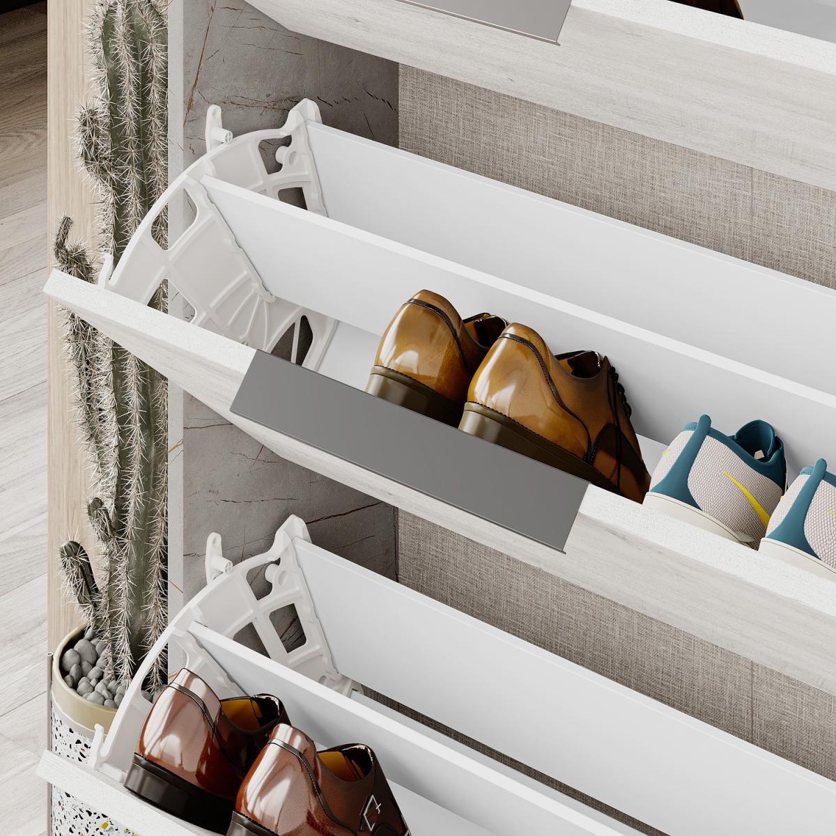 I love this shoe cabinet for its clean, contemporary aesthetic and versatile colour palette. The white finish with a hint of gold marble effect adds a touch of sophistication, making it suitable for modern and minimalist interiors. It works particularly well in hallways or entryways where a streamlined storage piece can help keep clutter at bay while adding a subtle luxe feel. Practical styling tips include pairing it with neutral or metallic accents and keeping the top surfaces clear for decorative objects or plants. It’s a functional yet stylish choice that will effortlessly blend into various settings while providing smart storage for footwear.