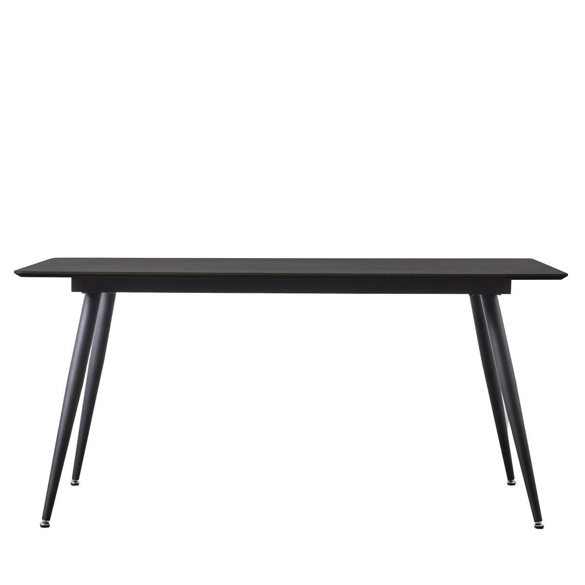 I’m a fan of how this black oak table’s slim, splayed legs and deep-toned top bridge modern minimalism and an industrial edge. It sits equally well in a Scandi-inspired space, an open-plan loft or a pared-back farmhouse kitchen, especially when paired with simple metal-framed or leather-upholstered chairs. For styling, start with a natural-fibre rug to anchor the setting and layer a runner or linen napkins down the centre. A trio of low ceramic vases or a linear candleholder adds interest without clutter, while a statement pendant light above helps define the dining zone. If you’d like a softer feel, introduce velvet seat cushions or a couple of potted plants nearby.