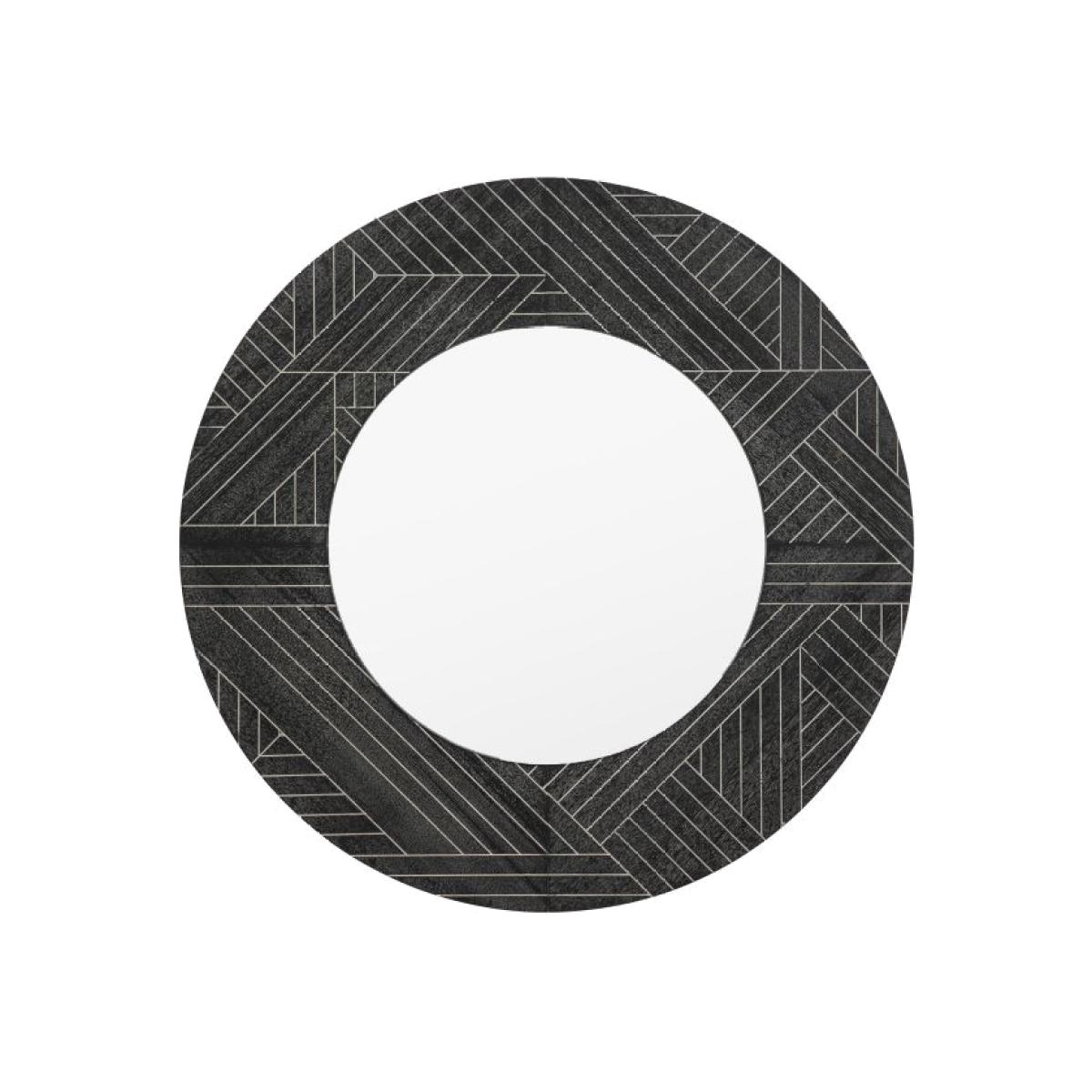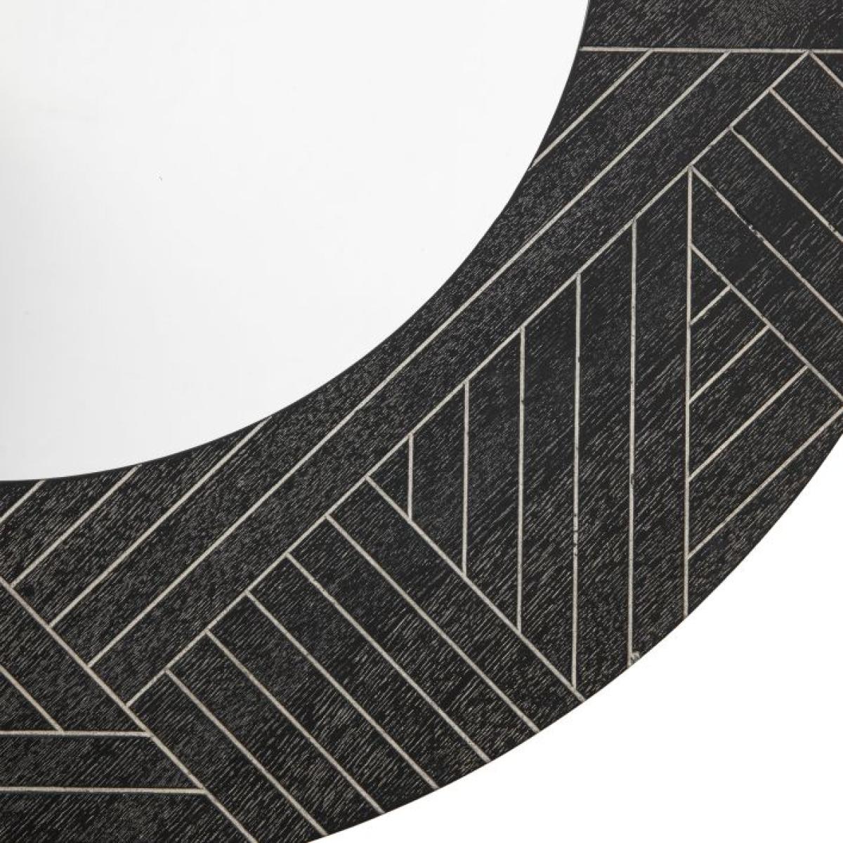 This unique contemporary mirror features a wooden frame in a black wash finish. The thin white geometric lines adds a striking visual impact to the home without overwhelming a minimalistic aesthetic. Available in two sizes.