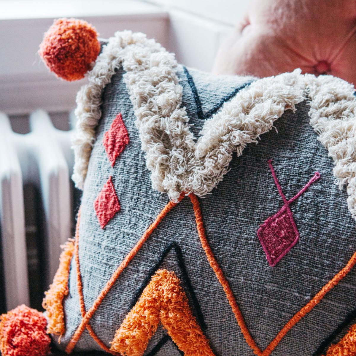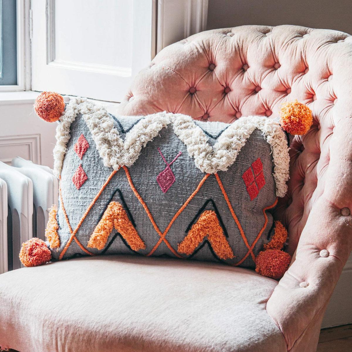 I love this cushion’s bold, ethnic-inspired design, which adds a lively, worldly touch to both contemporary and boho interiors. It works particularly well on textured fabrics like velvet or linen sofas and armchairs, where it can really stand out without overpowering the space. For styling tips, try pairing it with neutral or earthy tones to let the pattern and colours pop, or incorporate other accessories with similar warm hues or tribal motifs for a cohesive look. It’s also a great choice for adding visual interest to beds or bench seating, giving your space an eclectic, curated vibe.