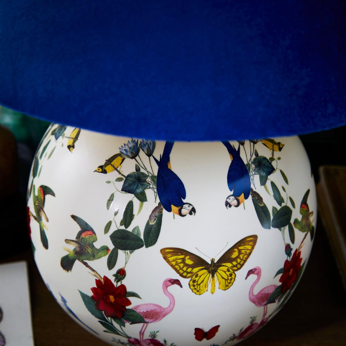 **In collaboration with the Natural History Museum*** Animal & Floral Print* Blue Velvet-Effect Shade* Made from Ceramic* In-Line Switch* Compatible with E14 Cap Type & Globe Bulb Type Brighten your space with the enchanting Kaleidoscope Ceramic Table Lamp. The round white base, adorned with a delightful animal and floral print, exudes charm - making it a unique addition to any room. The royal blue velvet-effect shade not only adds a touch of regality but also ensures a warm and inviting glow. This lamp is more than just a source of light; it's a statement piece that will captivate your guests. With an in-line switch for convenience, a cap type of E14 Small Edison Screw, and a recommended " Globe" bulb type, the Kaleidoscope Lamp combines style and functionality effortlessly, bringing a whimsical touch to your home.**Natural History Museum x Dunelm**From the intricate pattern of a butterfly’s wing to the petal formation of a flower, symmetry is everywhere in nature. In the Kaleidoscope collection, elements from nature collide to create mesmerising abstract shapes and mirrored compositions. Brimming with detail and pattern, this dizzying journey uses colour from brightly coloured butterflies and tropical birds on a rich background for a dramatic look. © The Trustees of the Natural History Museum, London 2024. All Rights Reserved.