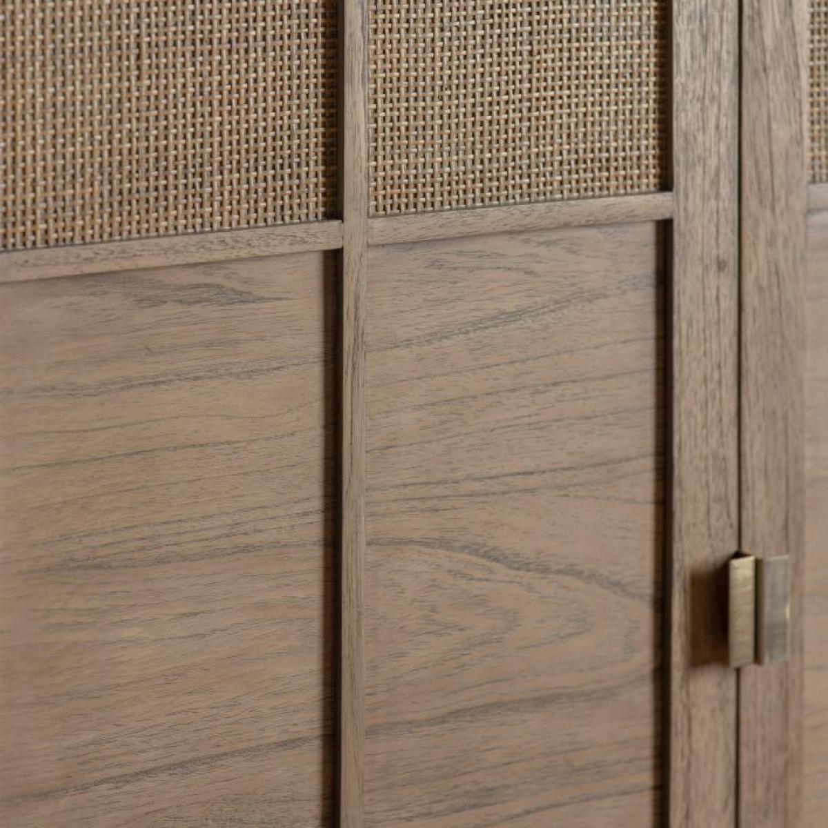 Our Kali collection has been developed with Japandi influences to give the ideal fusion of Japanese and Scandinavian design. The perfect range to add a touch of unique style to any interior, featuring a traditional lightly weathered finish with modern slatted detailing, cane panel inserts on some doors and brushed bronze handles. This two door cupboard features handwoven cane inset into the top section of the doors, paired with Mindy ash solids and veneers, in a soft natural colour. Also including a sideboard, media unit, coffee and console table, plus a practical supper table and unique slatted side table, this collection adds a touch of simplistic minimalisation to any interior space. Material: Solid Mindi. Colour/Finish: Natural. Number of Doors: 2.