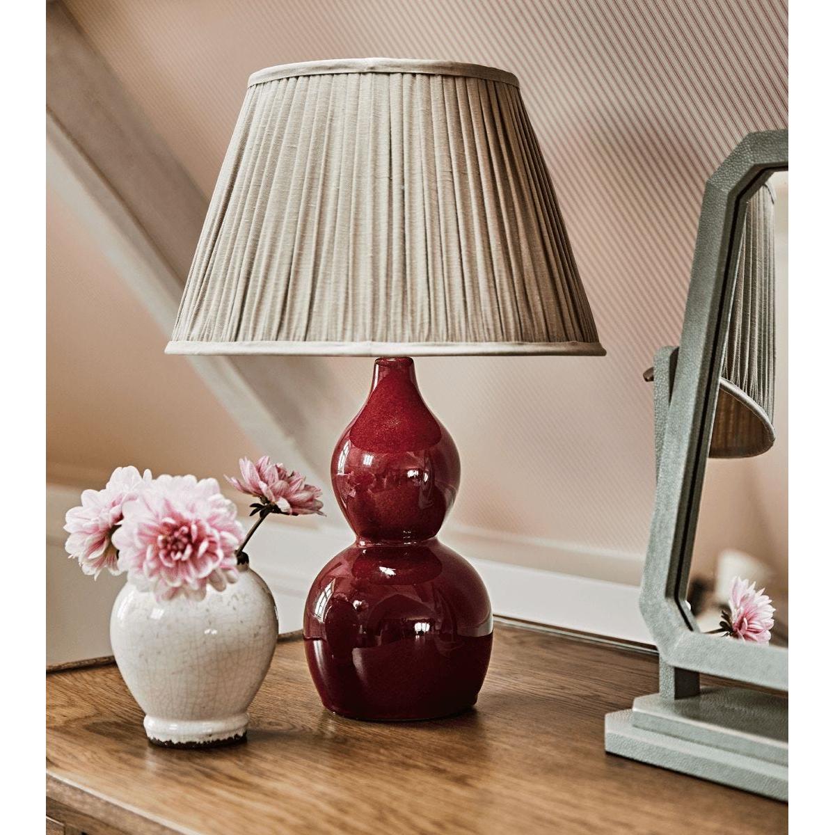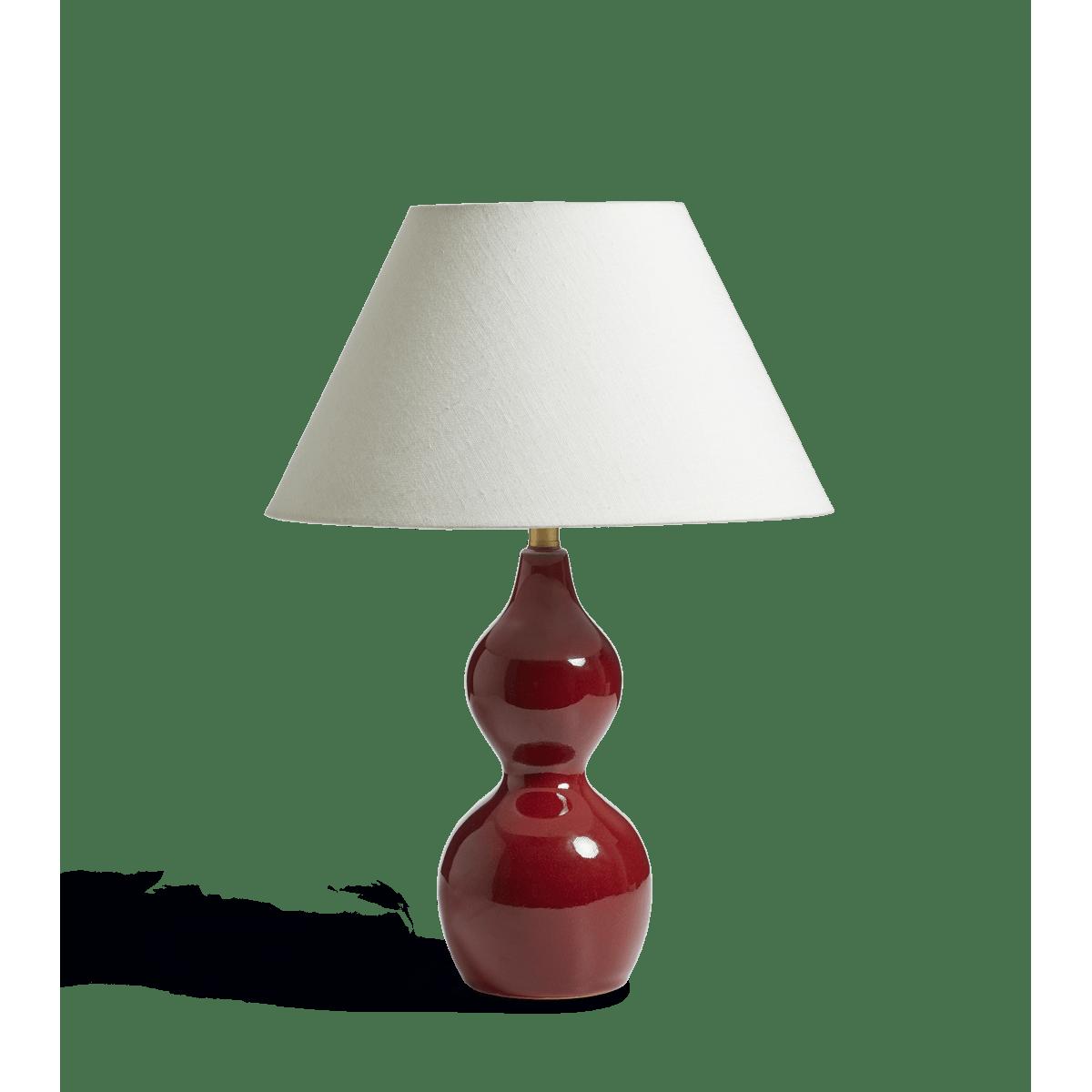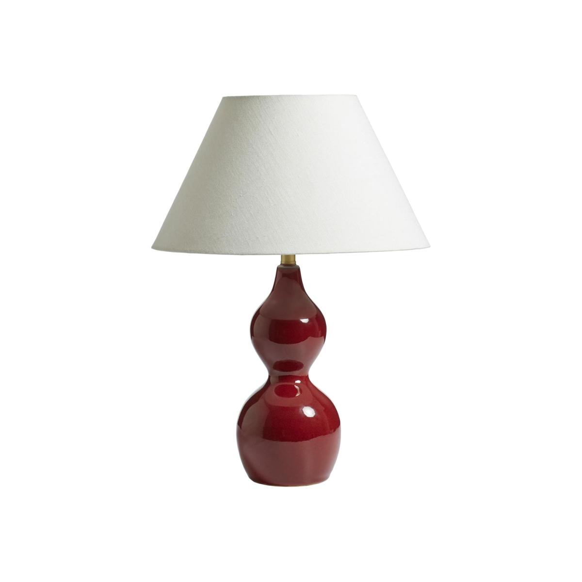 Our Kalinda emulates the curving shape of our popular Hulu Table Lamp, just in a more compact form. Its pleasing petite silhouette suits smaller surfaces, such as bedside tables or office desks. The ceramic lamp is handmade and finished in a beautiful Red Garnet glaze.