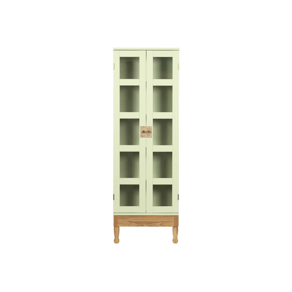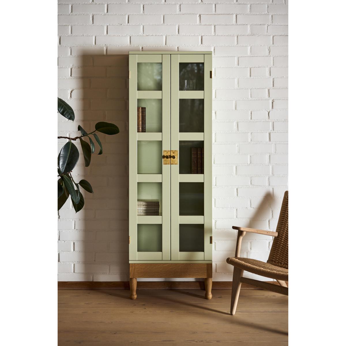 I love this bookcase for its striking combination of a light green oak finish paired with brass accents, which adds a subtle yet elegant touch to any room. It works particularly well in contemporary or Scandinavian-inspired interiors, but can also bring a refreshing contrast to more classic schemes. To style it effectively, consider using the open spaces to display a mix of colourful books, decorative objects, or potted plants to create visual interest. Its tall, slim profile makes it ideal for narrow spaces or as a statement piece in living rooms, home offices, or bedrooms. Practical tips include balancing the display with larger items at the bottom and smaller items on the upper shelves, while keeping the brass handle as a focal point. This piece can blend functionality with a touch of personality, perfect for anyone looking to add colour and unique character to their shelving.