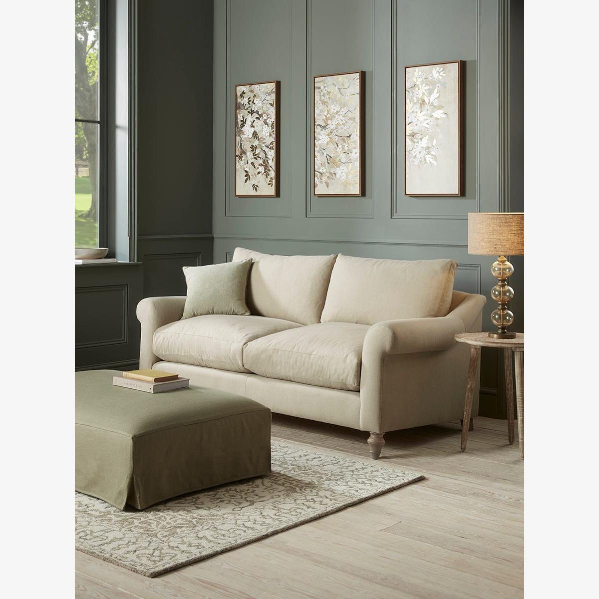 I’m a fan of this slate-blue herringbone three-seater because the subtle weave gives plenty of texture without overwhelming a scheme, and the turned legs and rounded arms strike a balance between traditional and contemporary. It sits equally well in a Scandi-inspired living room with pale woods and crisp whites or in a more eclectic space layered with patterned rugs and brass-toned accessories. For easy styling, add a couple of soft neutral cushions and a cosy wool throw to pick up the undertones in the fabric, then position a slim side table alongside rather than in front to keep the lines clean.