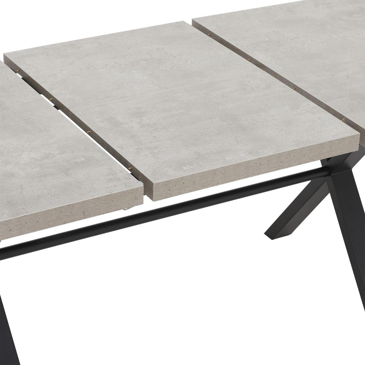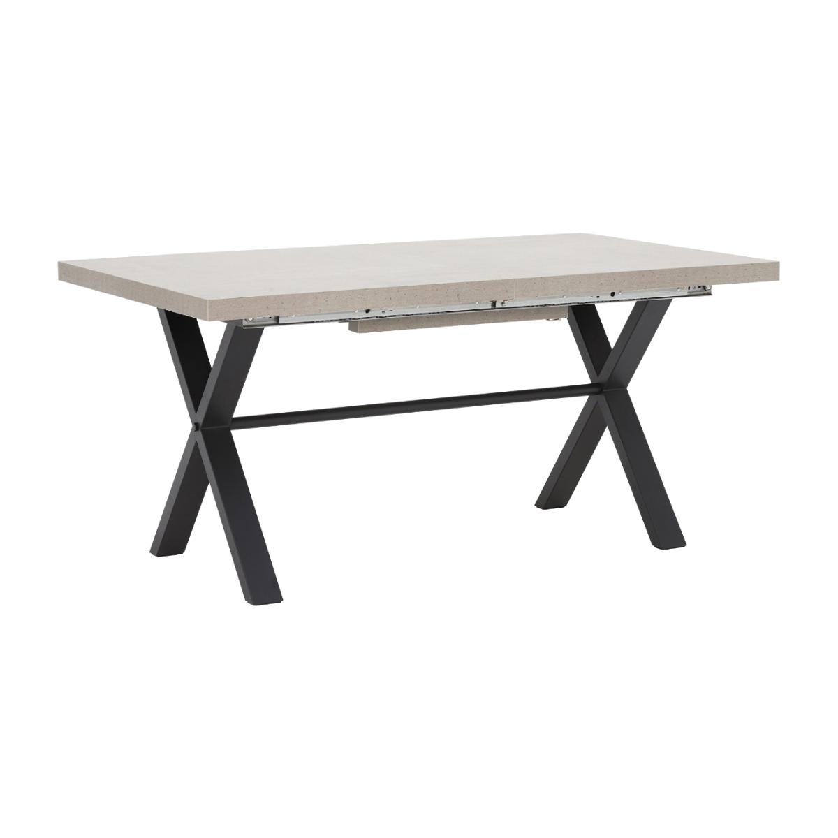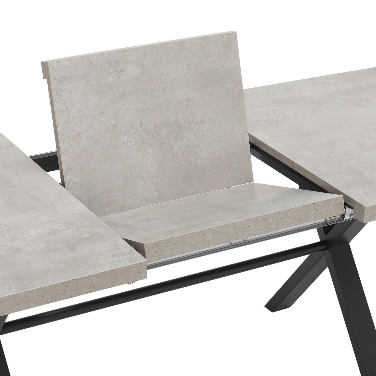 Design. Need space for a couple more guests? The Kalmer Extension Table is a sleek and sophisticated addition to any modern home, and operates on a butterfly extension mechanism to transform a four seater table to a six seater. The concrete top sits upon black X-shaped legs for an eye-catching statement that will easily accommodate a range of dining chairs with its neutral tones.