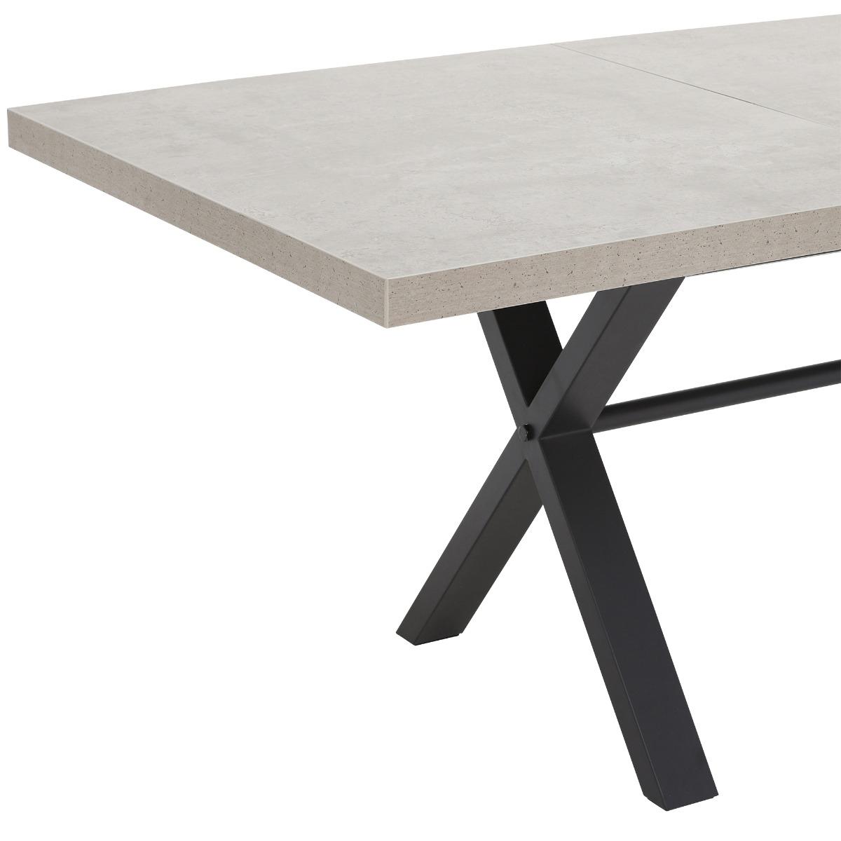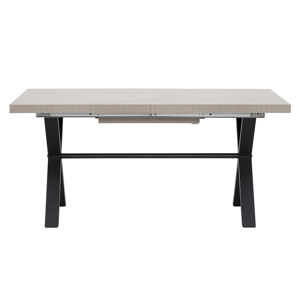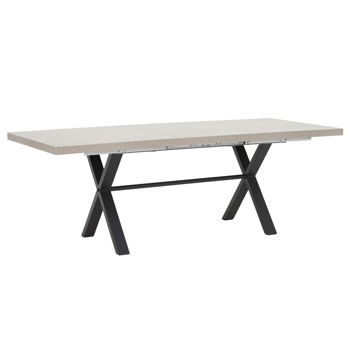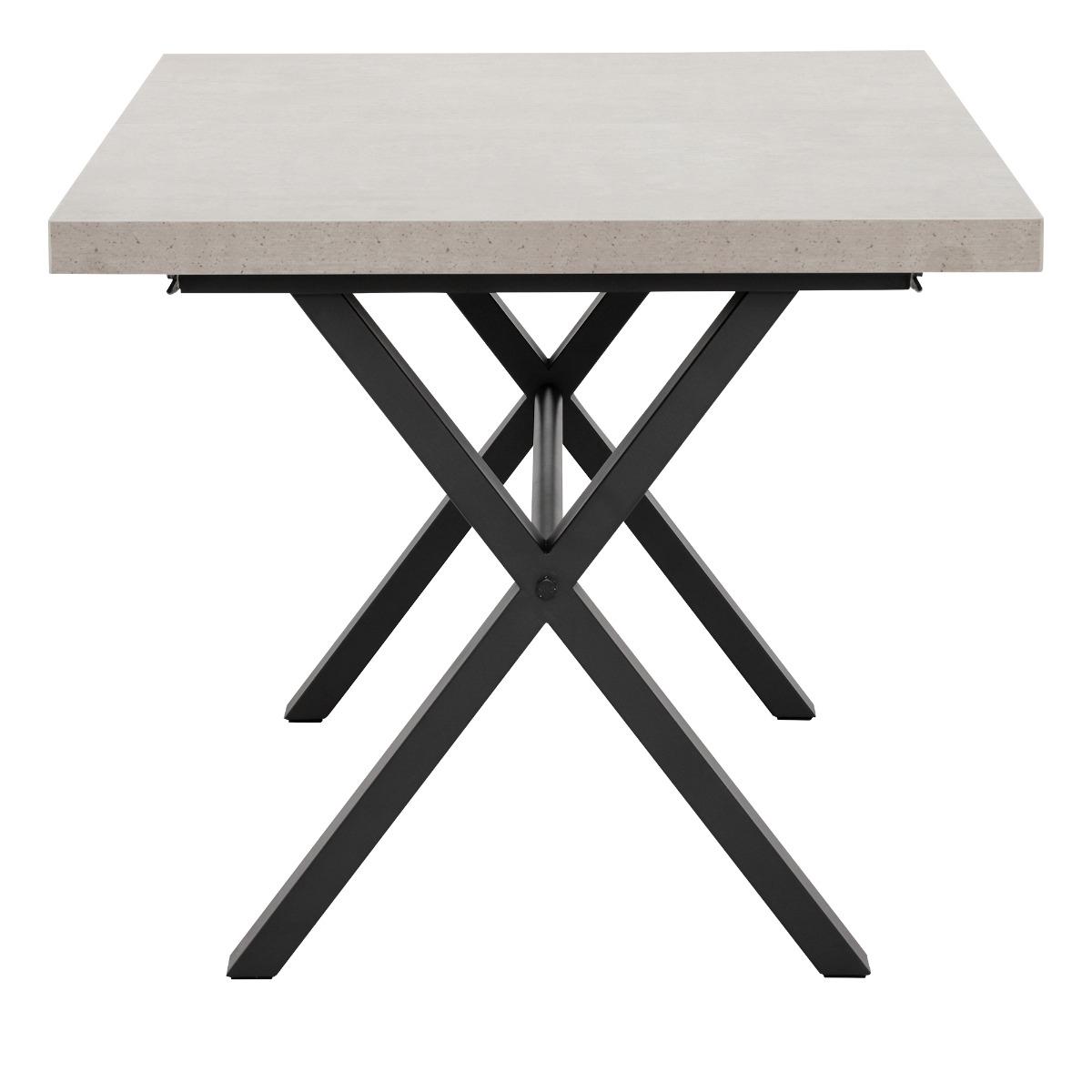 Design. Need space for a couple more guests? The Kalmer Extension Table is a sleek and sophisticated addition to any modern home, and operates on a butterfly extension mechanism to transform a four seater table to a six seater. The concrete top sits upon black X-shaped legs for an eye-catching statement that will easily accommodate a range of dining chairs with its neutral tones.