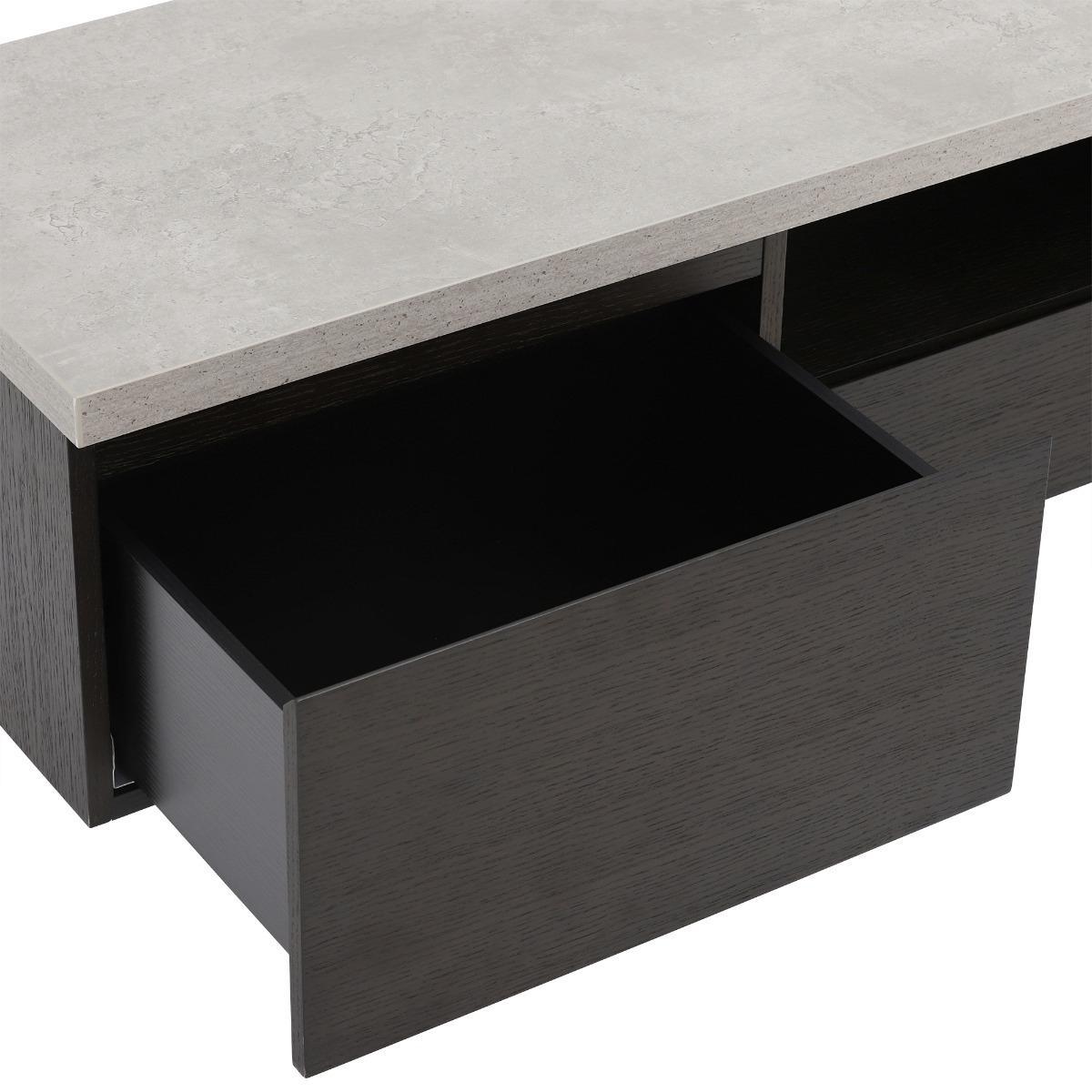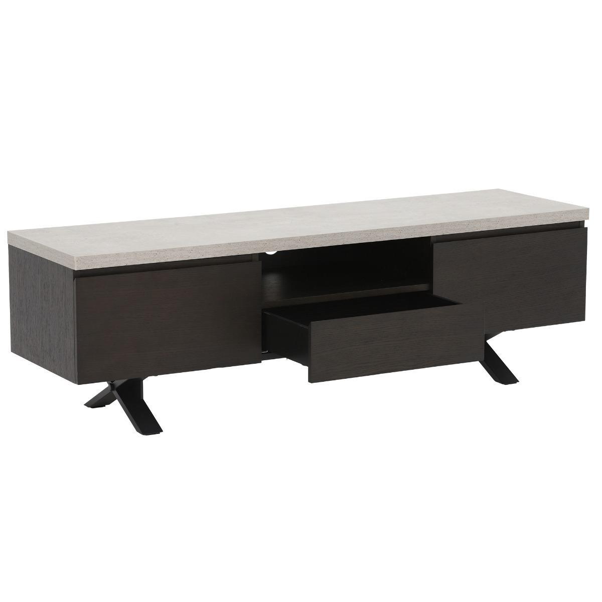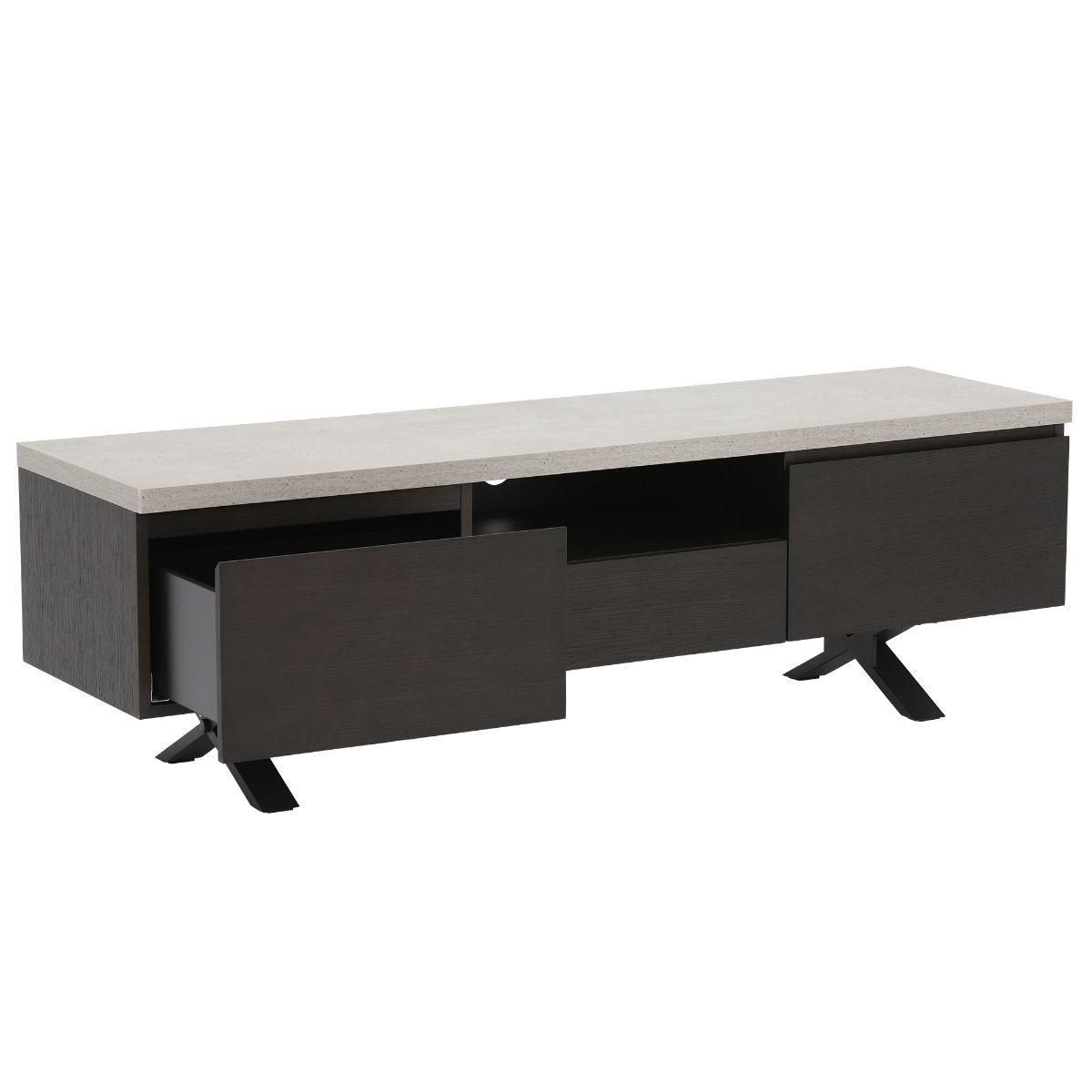 Design. Bring modern influence into your living room with the Kalmer TV Stand, boasting rich chocolate tones and a concrete surface. Featuring three sizeable drawers, this media unit is the perfect place to organise your router, DVD’s, consoles and more. Kalmer’s sleek, sophisticated design is achieved by replacing handles with grooves for easy opening, and a smooth contemporary finish.
