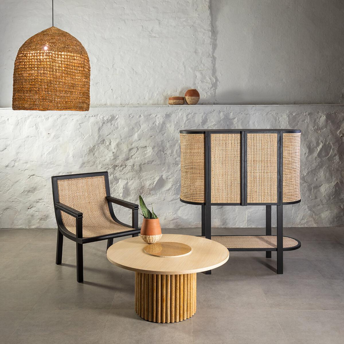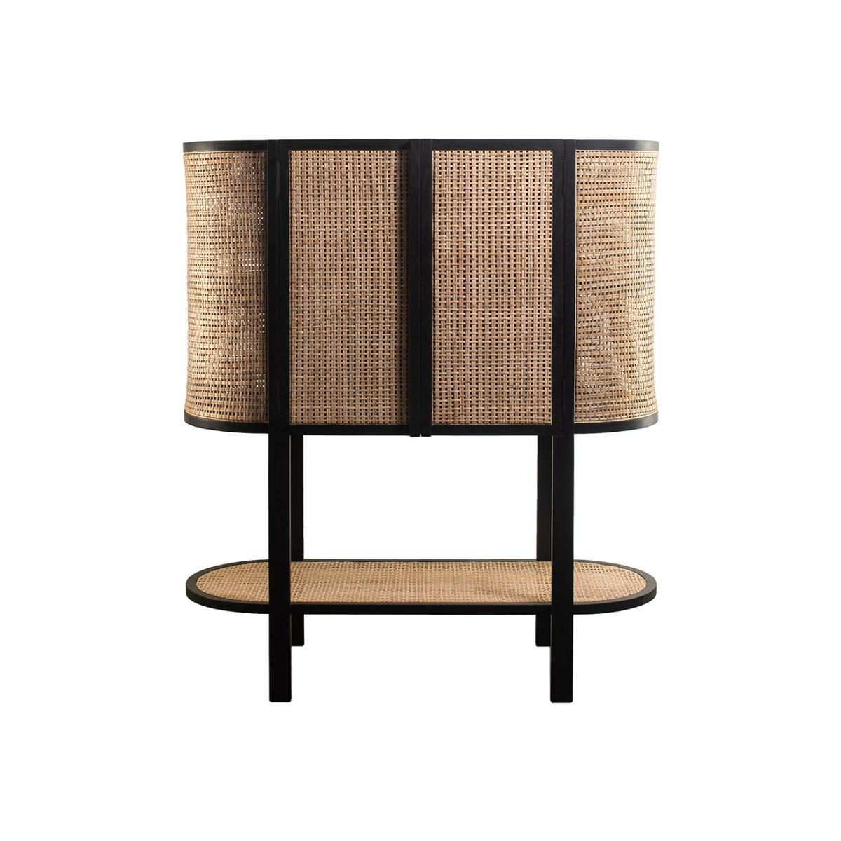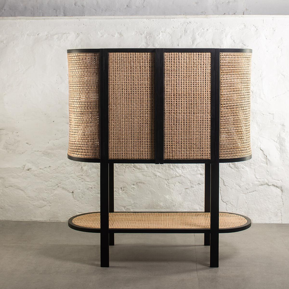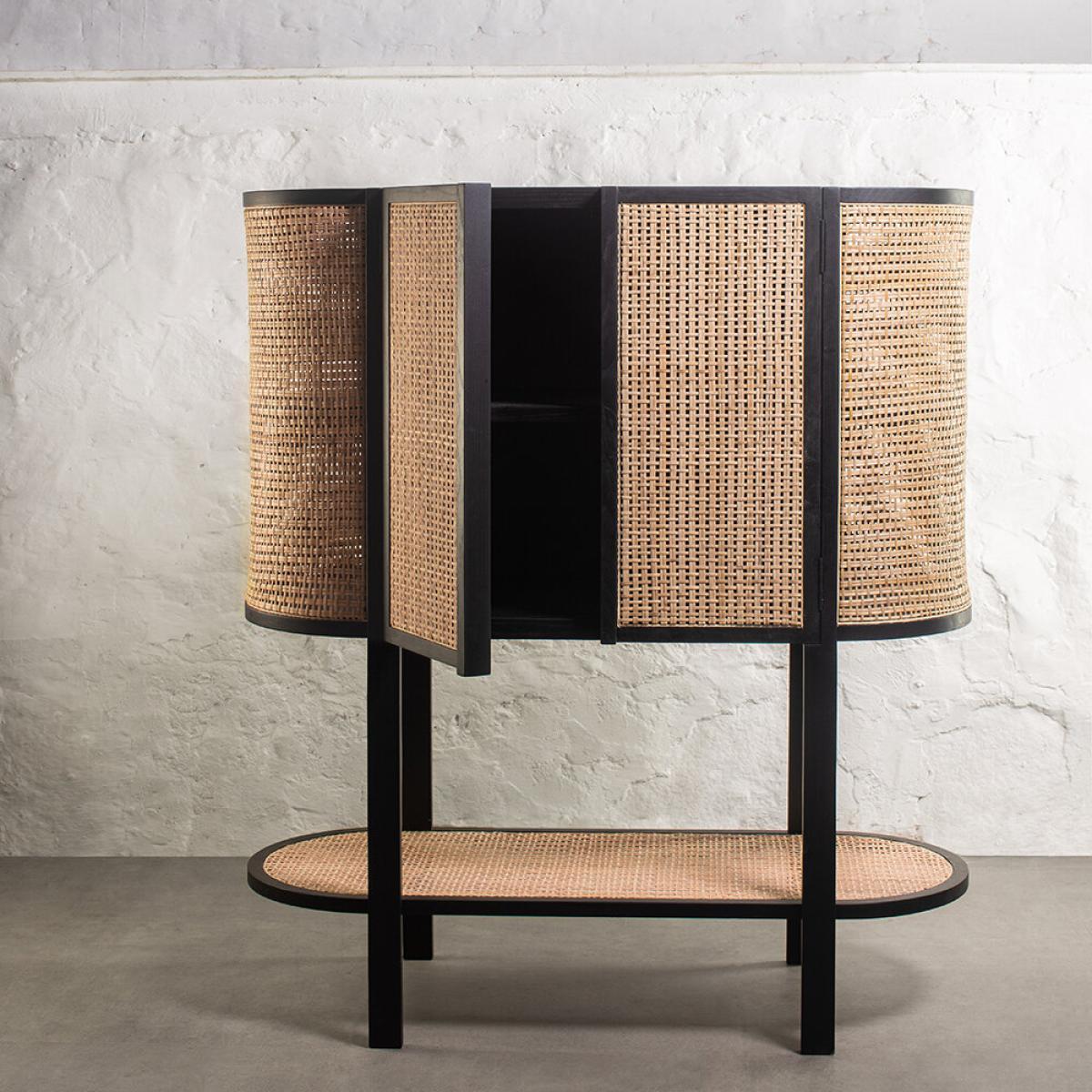 I love this piece for its sleek black ash finish and versatile design, making it a stylish yet practical addition to various interiors. It works particularly well in modern or Scandinavian-inspired spaces, where it can provide a sophisticated contrast or complement lighter tones. The rattan detailing adds texture and warmth, making it suitable for both traditional and contemporary settings. Practical styling tips include pairing it with minimal accessories to highlight its craftsmanship, or using it as a statement piece in a lounge or dining area for a functional focal point. Its clean lines and classic materials also lend themselves well to layering with other natural textures like wood or linen for an effortlessly polished look.