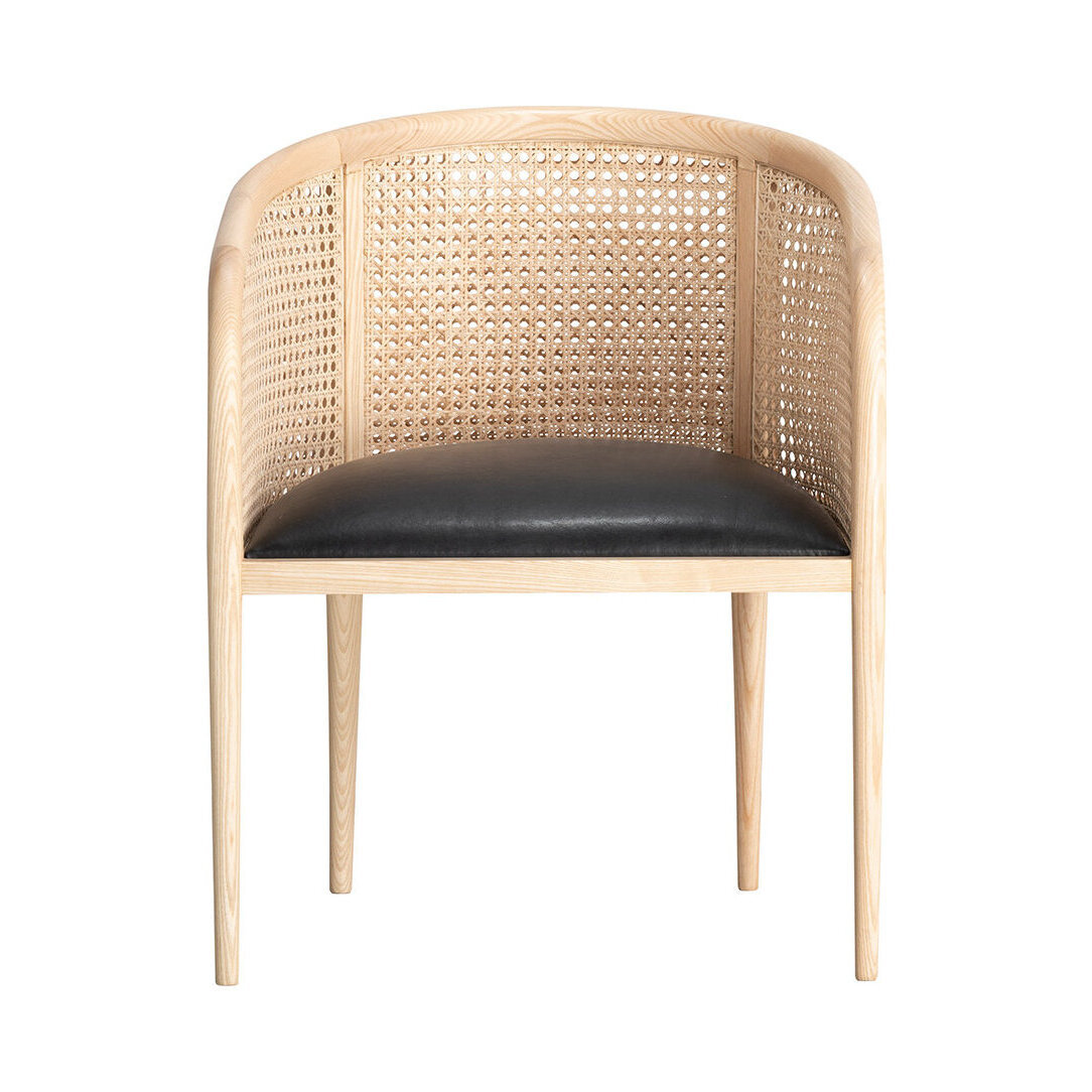 I love this piece because it combines classic materials with a modern silhouette, making it quite adaptable. The mix of black leather and natural cane gives it a sophisticated yet relaxed vibe, perfect for both contemporary and more traditional interiors. It works particularly well in spaces that balance luxury with warmth, such as a neutral-toned dining room or a stylish, casual café setting. For styling tips, pair it with textured tableware or complement the natural cane with woven accents to enhance its organic feel. To keep it looking fresh, consider using a soft leather conditioner and avoiding harsh sunlight that could fade the cane over time. This chair is versatile enough to sit comfortably in a variety of settings, adding a touch of understated elegance wherever it goes.