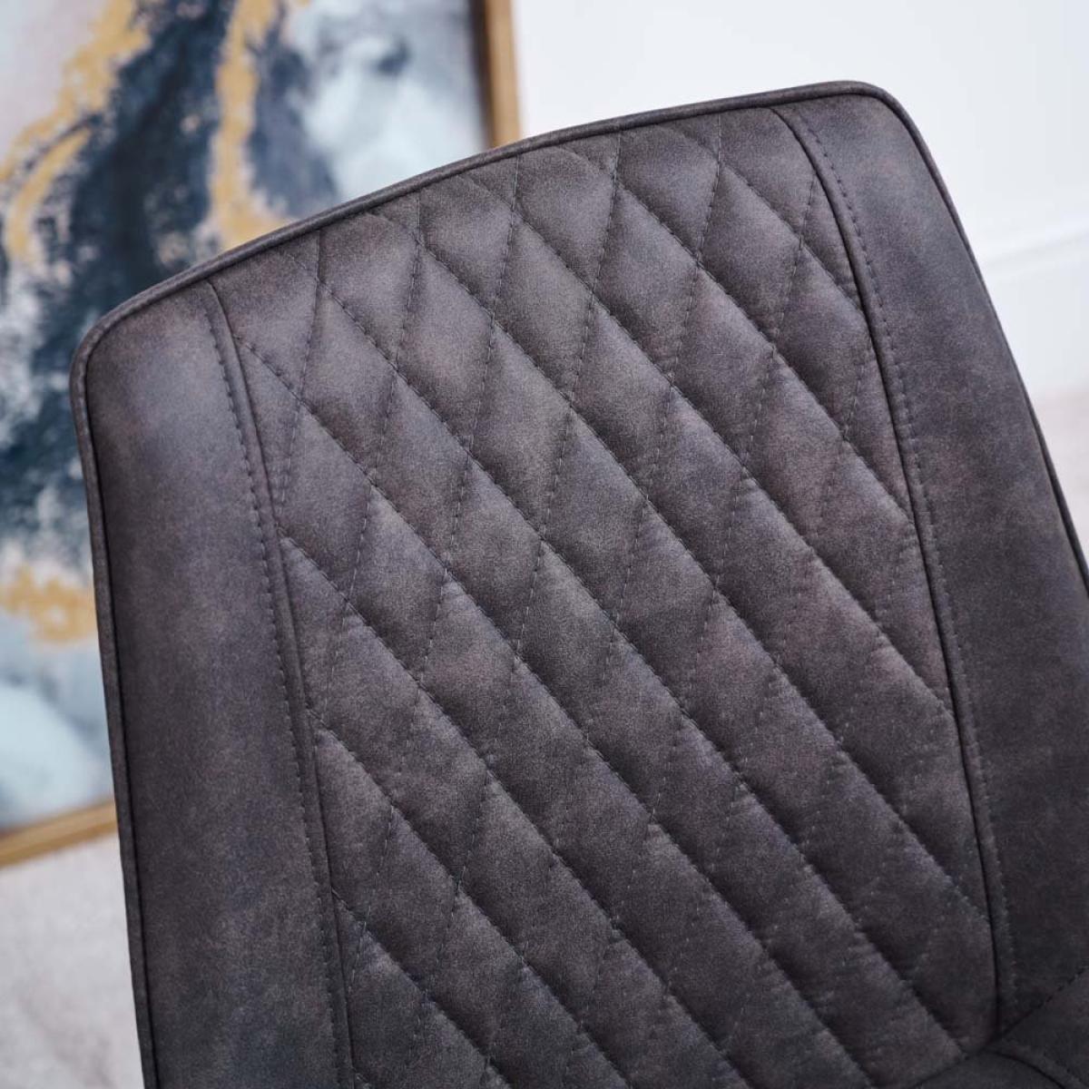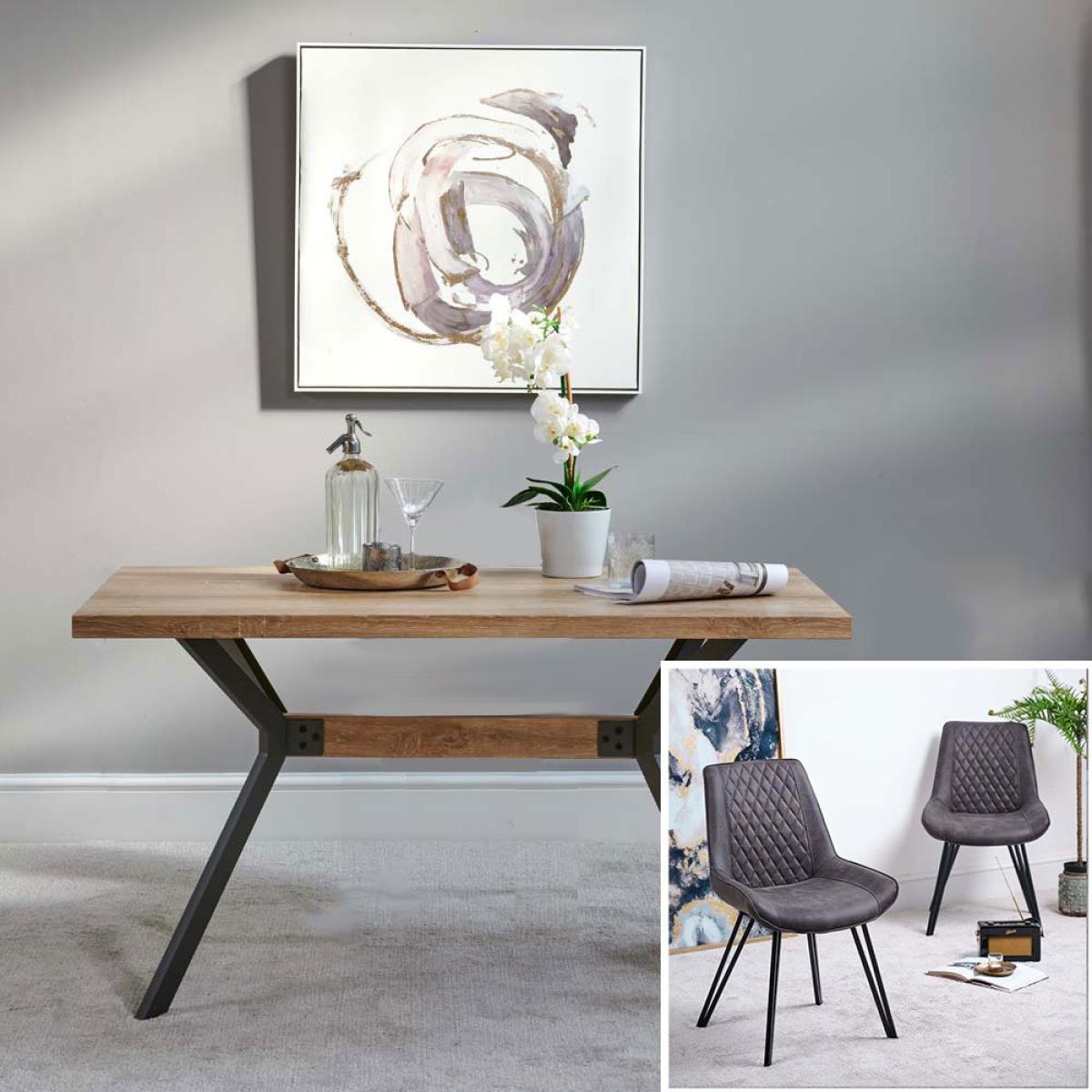 This dining set features the Kamala Table 140cm and 4 finnick dining chairs. The Kamala is one of our most popular dining tables and features a smooth wood-effect top which is heat and stain resistant and industrial style grey metal legs supported by a centre wood-effect strut. The melamine shell on the table top is indented to display the beautiful feature of a natural wood grain. The finnicks hava bucket seat style with diamond stitched faux leather upholstery. Together the chairs and the table make a stunning set suitable for many home style.