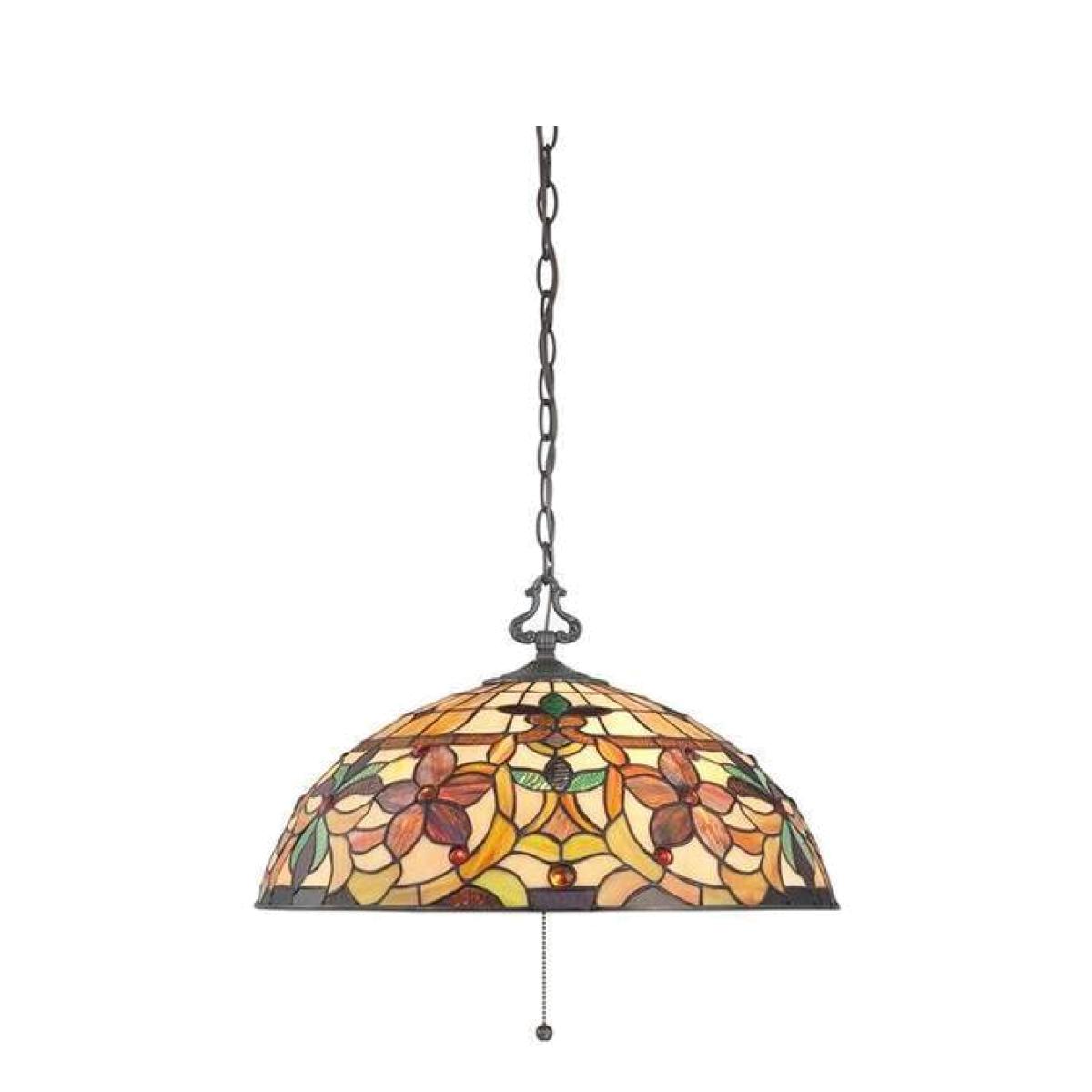 This lovely Tiffany style ceiling pendant features a hand-crafted, genuine art glass shade created in hues of amber, caramel, ginger and emerald. The glass is arranged in a classic Art Nouveau pattern. The warm colour palette creates a harmonious balance of light, and the complementary chain is finished in Vintage Bronze. Also available in this range Uplighter, Flush-Flush, Table Lamp, and Wall Uplighter.