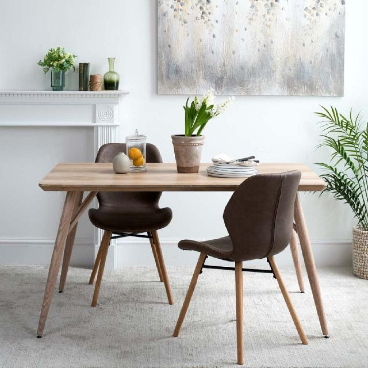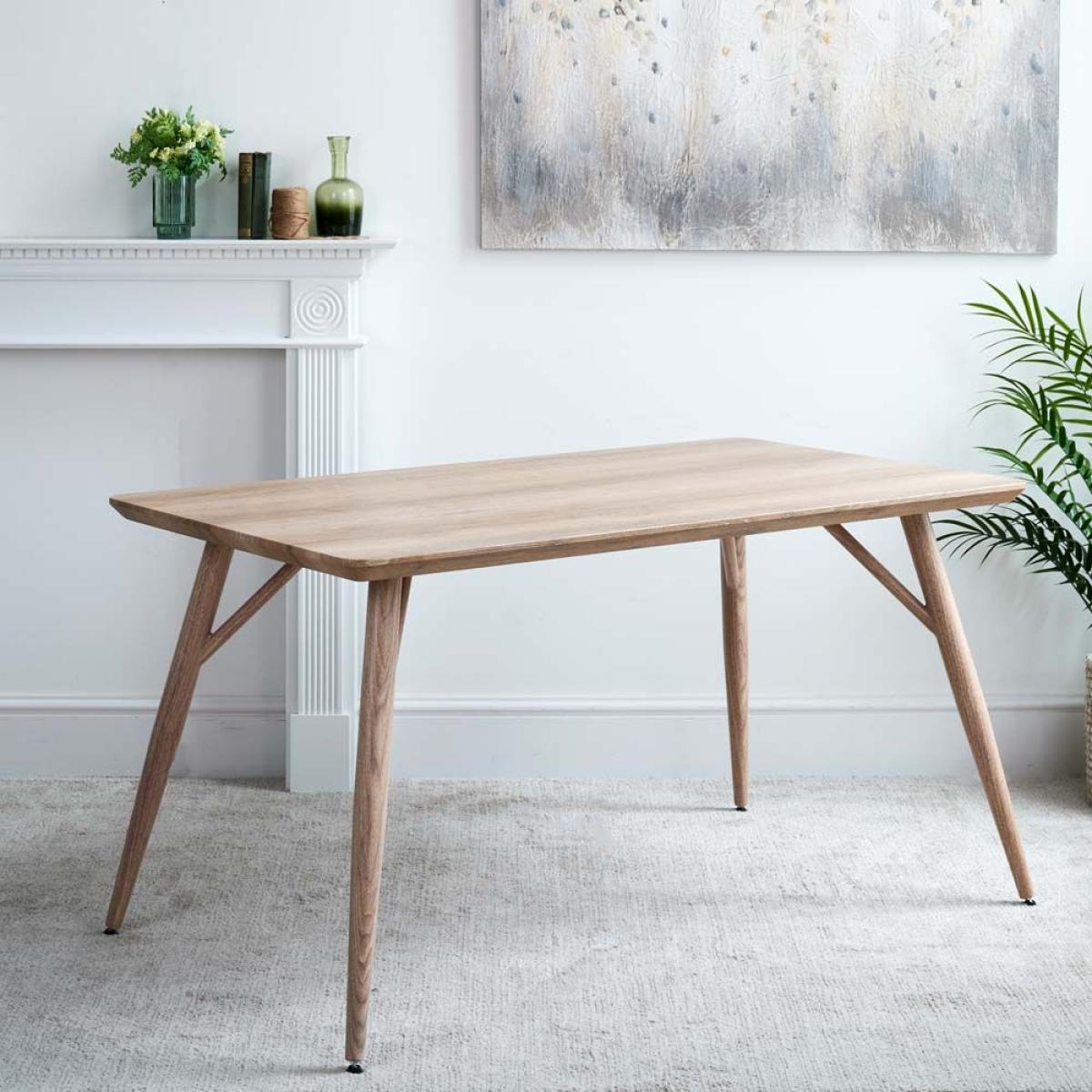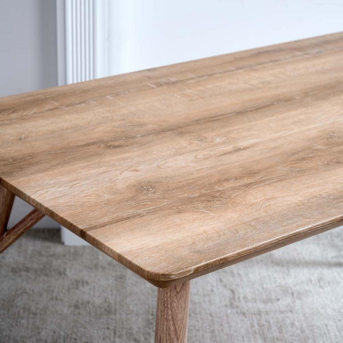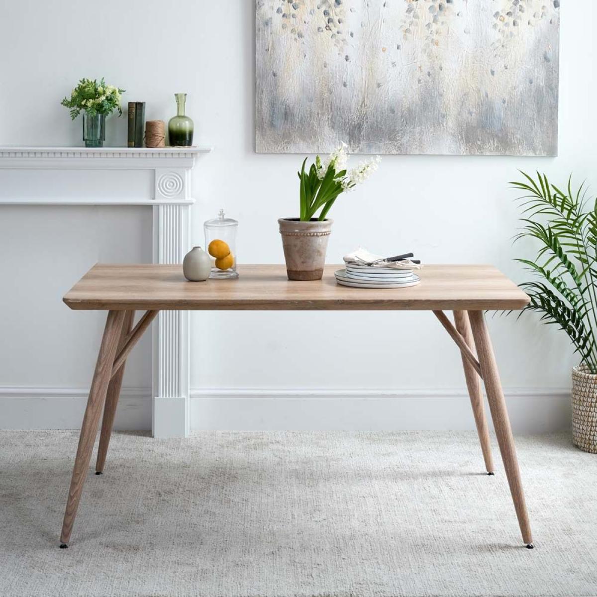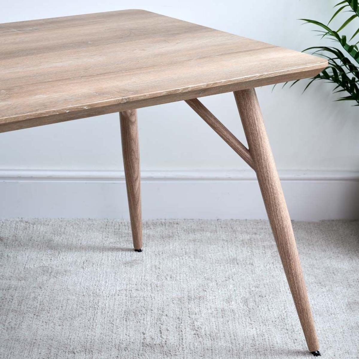 The Kaminly Small Scandi Dining Table has a pale faux wood finish created from a textured foil wrap. The finish feels like real wood, but it's durable and stain resistant. The legs are made from metal for longevity but again wrapped in a wood effect coating. Comfortably sitting four, and even for six with one at each end, this small Scandinavian dining table is great for use in a kitchen/dining room.