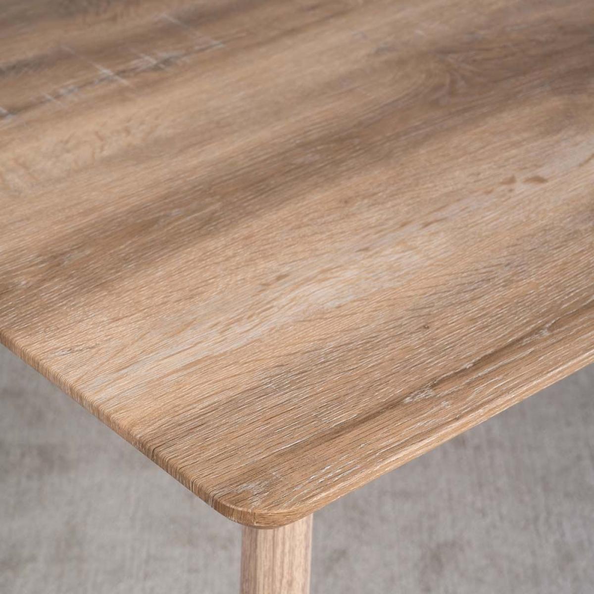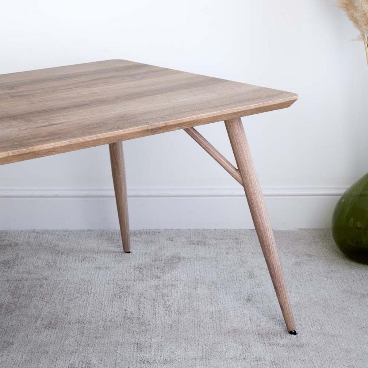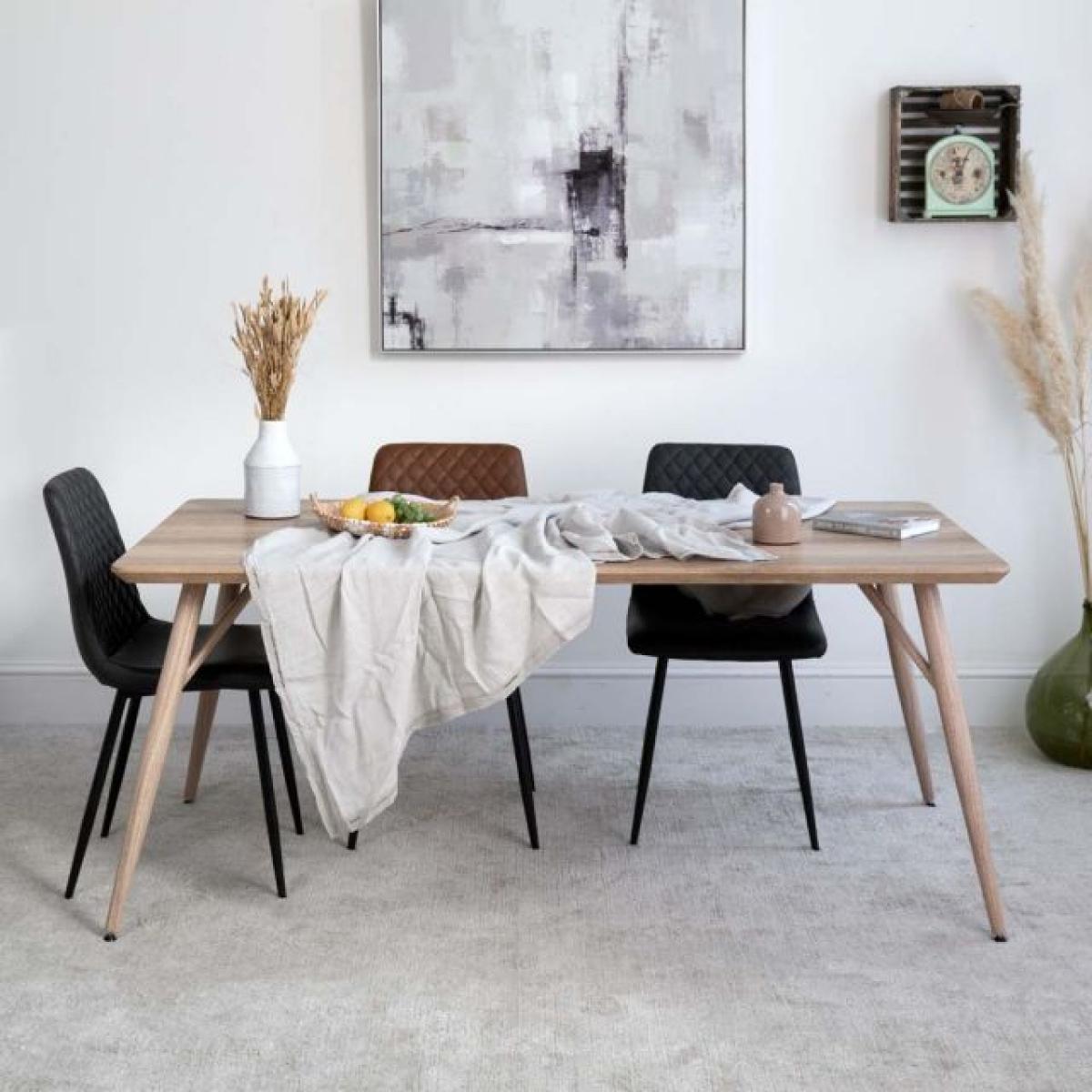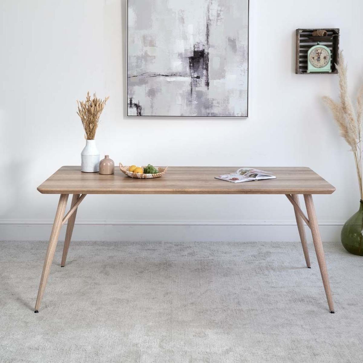 The Kaminly Medium Scandi Style Dining Table is a beautiful table with a pale faux wood finish created from a textured foil wrap. The finish feels like authentic wood, but is durable and stain resistant. The legs are made from metal for longevity but again wrapped in a wood effect coating. Comfortably sitting six, this Scandinavian dining table is great for use in the kitchen or dining room.