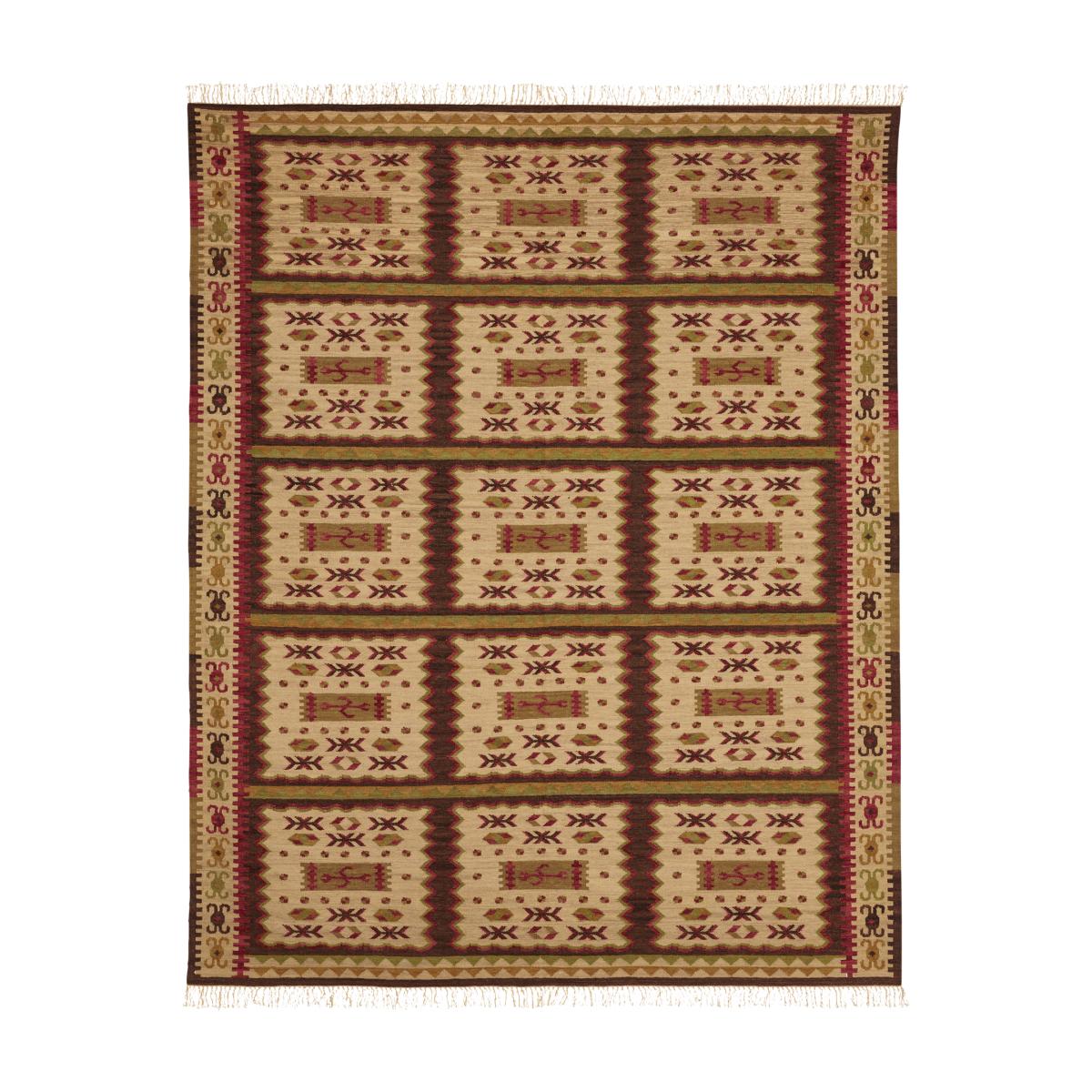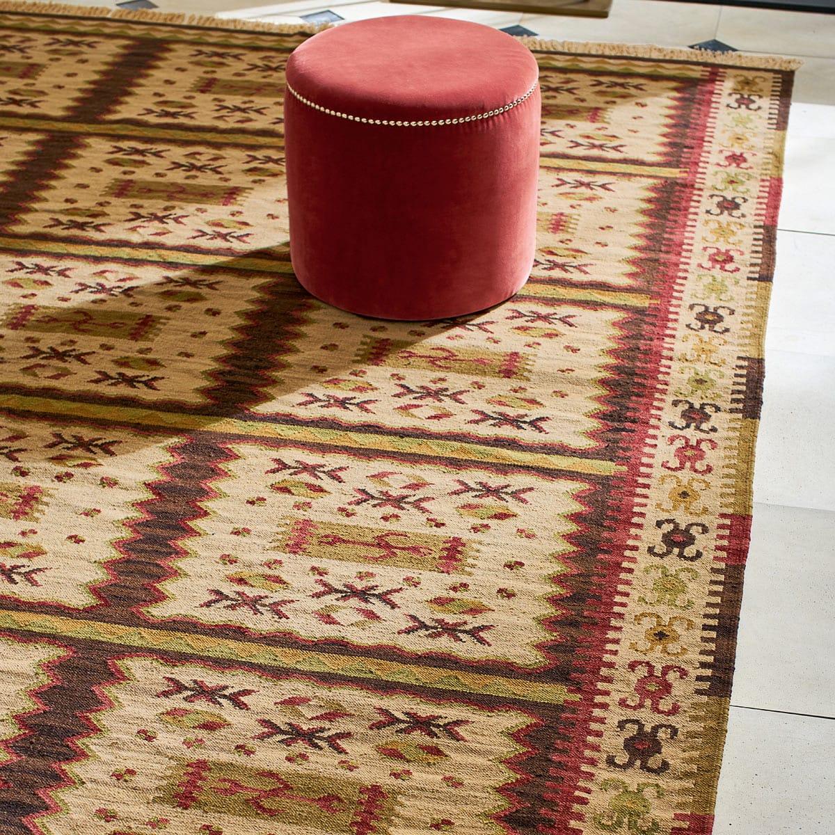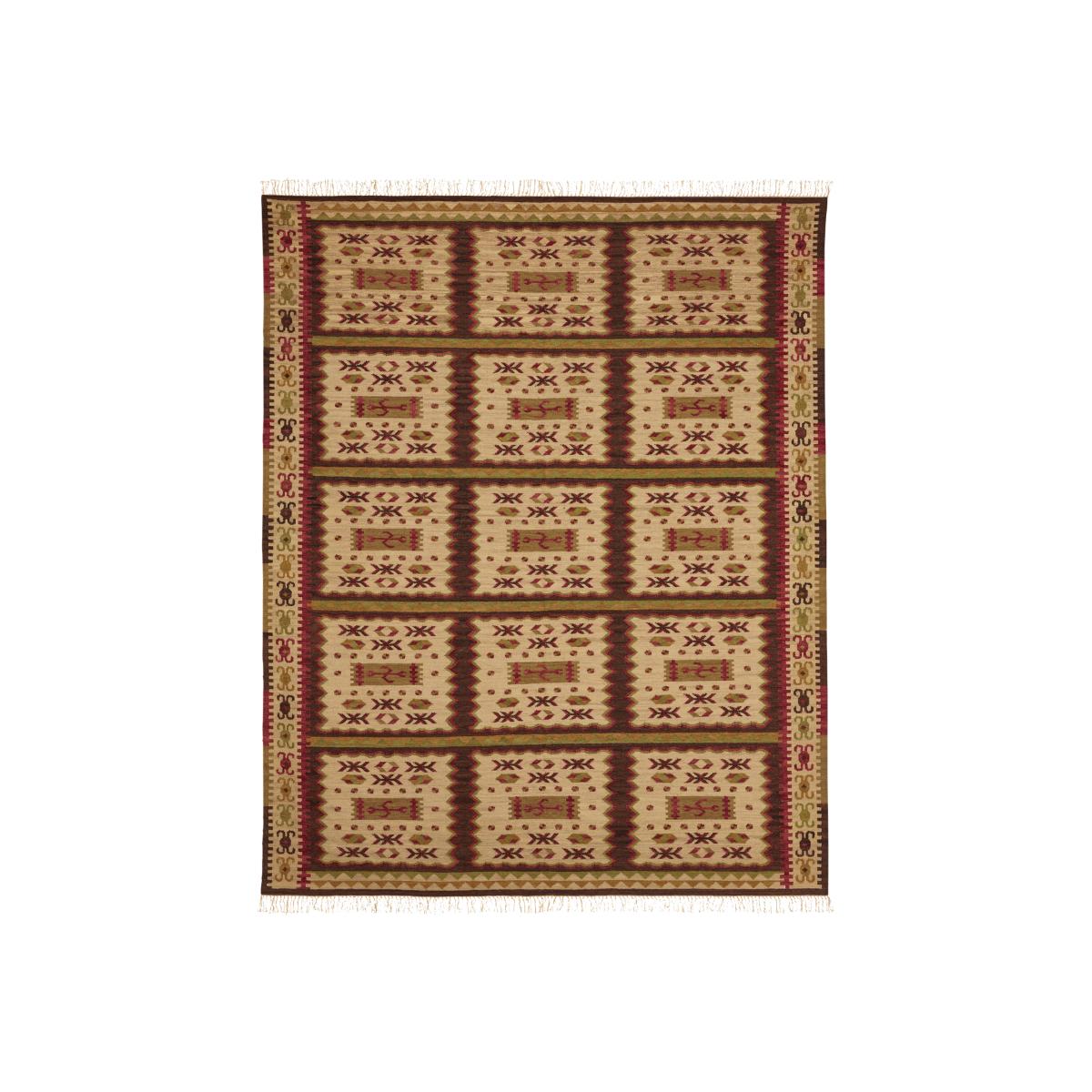 A detailed kelim rug in earthy tones of brown, red and pale gold, flat-woven by hand in the traditional Turkish style. Adorned with a repeating ‘wheel of fortune’ symbol denoting wealth, our Kanati Rug will add pattern to a space without being overwhelming.