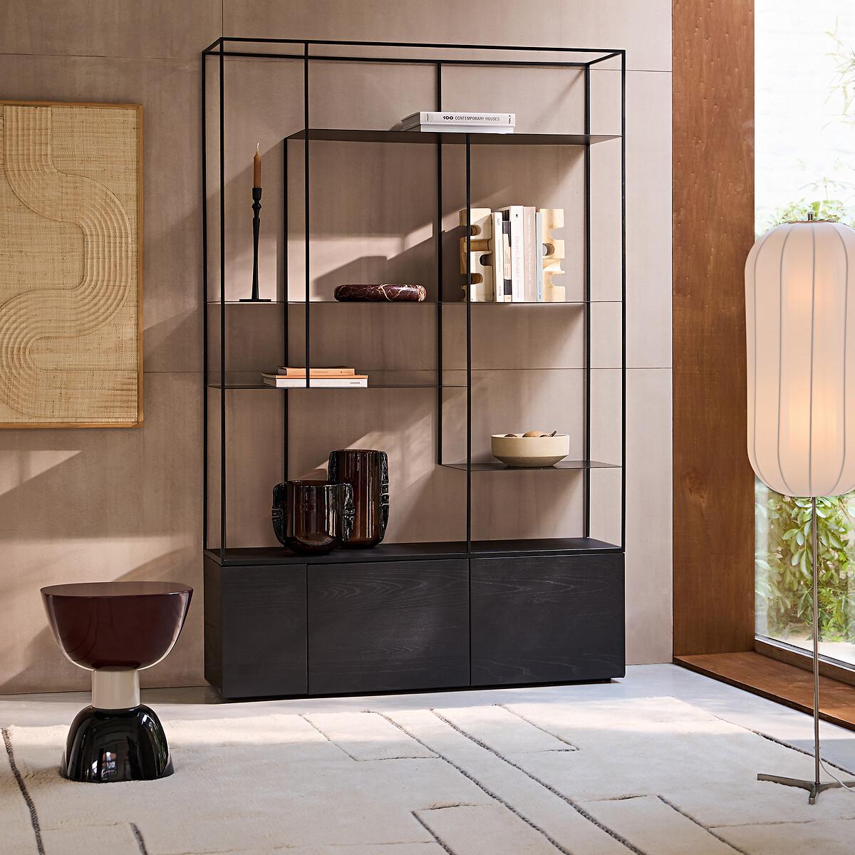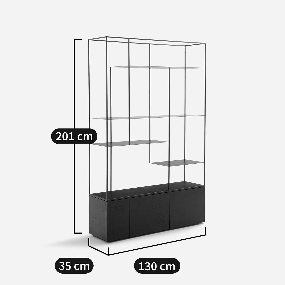 Its lightweight metal structure seems a natural fit for the black wood storage unit with its exposed grain. Straight metal lines extend downwards, completed by doors that create a visual link between the two spaces. Graphic and functional, this hybrid piece of furniture, part shelving and part bookcase, also acts as a room divider without taking up too much space, thanks to its delicate design. To optimise storage, the interior shelves are adjustable and removable. An AMPM creation. Product Details • High wire frame and 4 iron shelves, black epoxy finish, thickness 10mm • Lower unit, doors and interior shelves in painted elm-veneered MDF, FSC® certified wood, nitrocellulose varnish finish • 3 doors with soft-closing system • 2 adjustable, removable interior shelves Quality Info • This furniture is equipped with German brand hardware: reliable, discreet and functional. These accessories ensure the longevity of your product. • Soft-closing : system for closing doors smoothly, silently, also preventing fingers from getting caught.Dimensions. Overall../../RTXT_WEB/bull.jpg" />Width: 130cm • Height: 201cm • Depth: 35cm. Usable space • Space between top shelf and top of bookcase : 26.2cm • Space between middle and top shelves : 52.4cm • Space between the middle shelf and the one directly below it : 26.2cm • Space between top and bottom shelves: 52.7cm • Space between bottom shelf and cabinet: 25.5cm • Behind the doors, 2 compartments (without shelves): L75 x H26.5 x D30.5cm and L48.5 x H26.5 x D30.5cm • This product requires assembly. • WOOD FROM SUSTAINABLY MANAGED FORESTS. FSC® certified wood comes from forests that are environmentally, socially and economically well managed. Dimensions and weight of parcel2 parcels • L171 x H42.5 x D138cm. 52kg • L139 x H52 x D43cm. 36.5kg