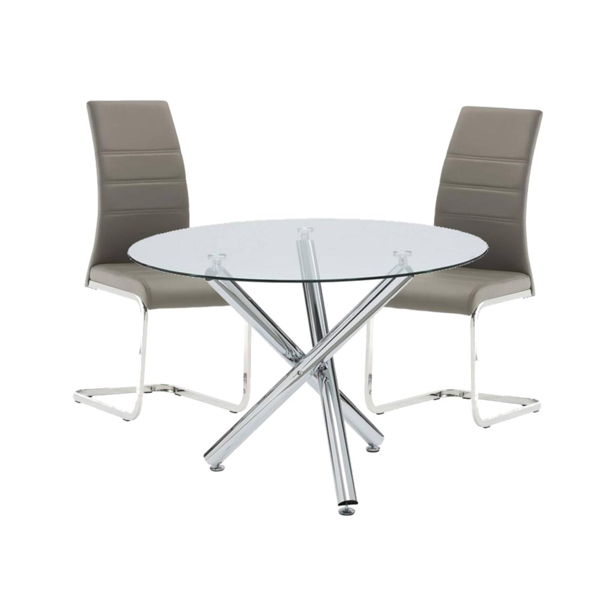 Modern dining set boasting a glass table with 4 grey chairs. A stylish addition to your dining room, this dining set is part of the Kansis Range from World Furniture. The table boasts a round clear glass table top, supported by polished chrome legs. It has been paired with 4 Soho dining chairs, each boasting polished chrome legs and a grey seat pad and backrest. This dining table and chair set is one which is perfect for kitchens, living rooms or dining rooms boasting contemporary home decor.