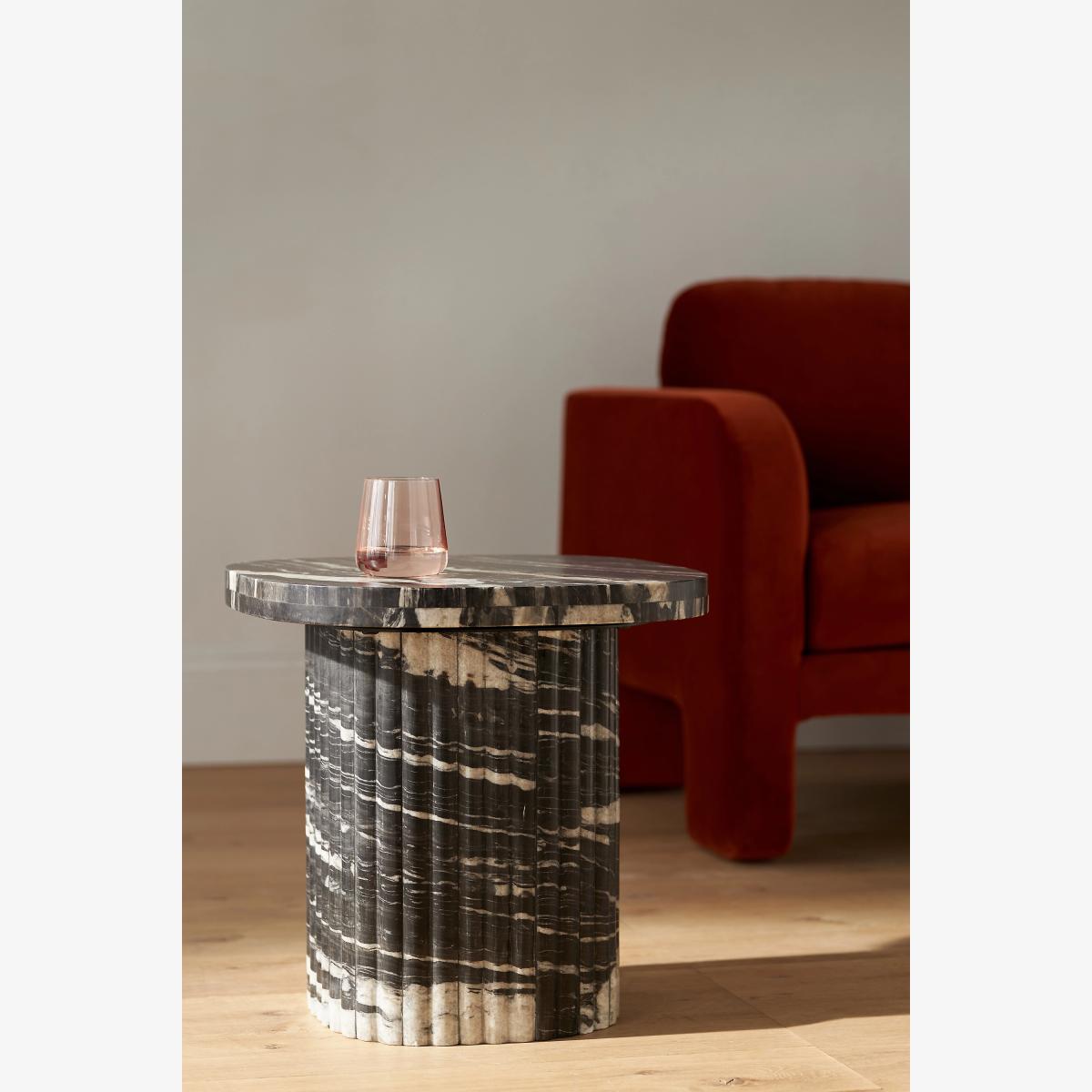 I’m a fan of this marble side table for its strong graphic veining and sculptural form - it acts as both a functional surface and a subtle statement piece. The dark, variegated tones work particularly well in minimalist or contemporary rooms where you want a touch of natural texture without fuss. To style it, keep accessories simple: a slim metal lamp or a single ceramic vase balances the weight of the stone, while a small stack of art books adds height interest. It also pairs nicely next to a low-slung sofa in muted tones or in an entryway alongside a soft rug, giving you a grounded spot to drop keys or display a small plant.