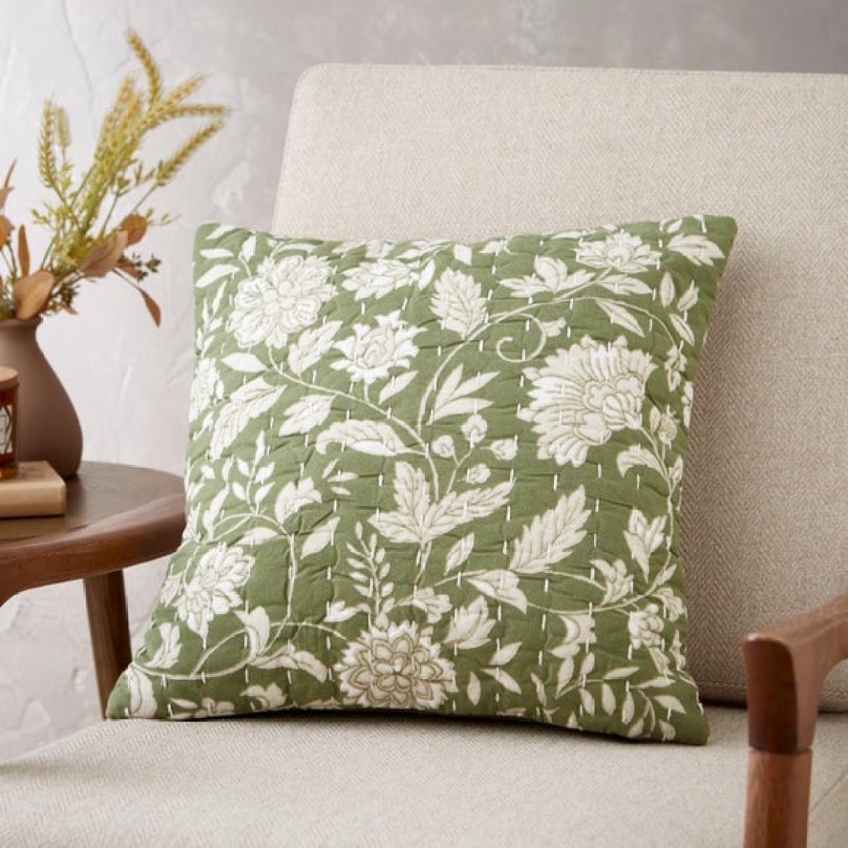 * Zip closure * Floral design * Matelassé weave * 100% cotton * Machine washable Craft meets comfort in this Kantha-inspired cushion cover. The square design brings folk art flair with a modern twist. 100% cotton, washable, and zip-secure—it’s a mini masterpiece for your sofa.
