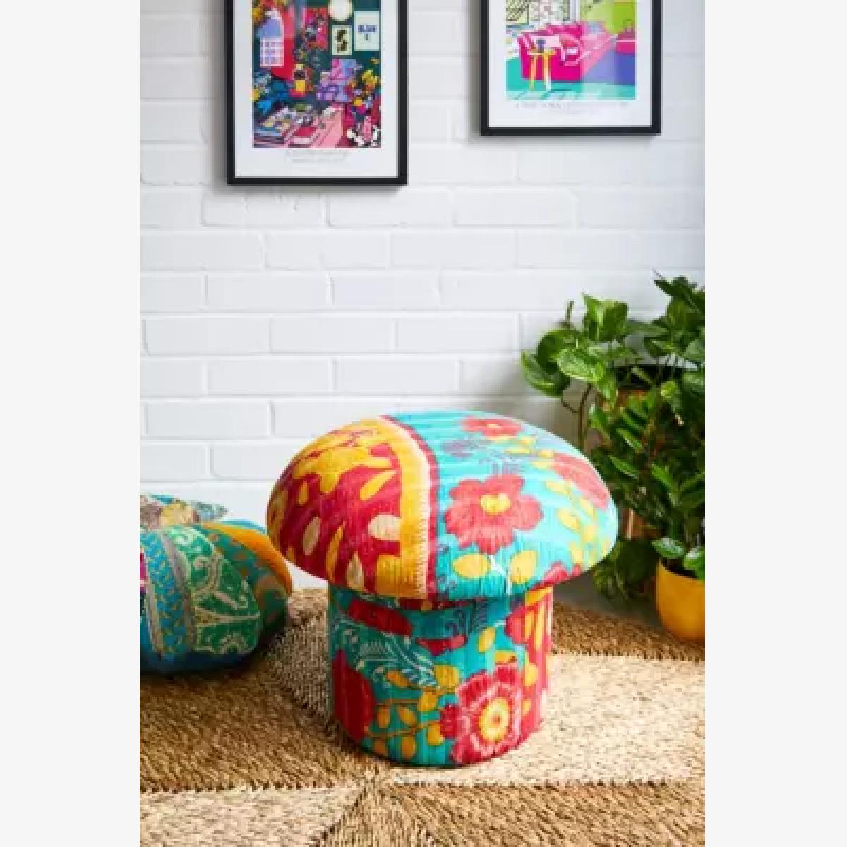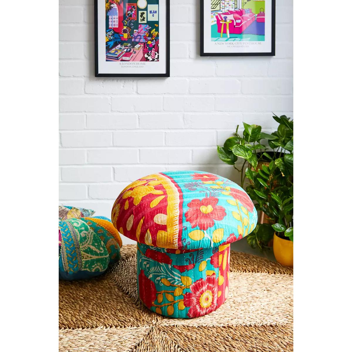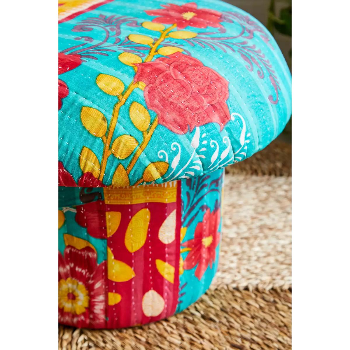 Add boho-style to your seating area with this mushroom stool. Upholstered in multi-print and multi-colour Kantha fabrication Ft. a hollow cylinder base perfect for storage use and a curved mushroom top. *Online return only. This item cannot be returned instore. Please note furniture items currently cannot be shipped to Northern Ireland or The Republic of Ireland. Delivery of large furniture items may take 1-2 weeks and are therefore not eligible for Next Day Delivery.* **Content + Care** \- Mango wood, MDF, Textile- Spot clean- Crafted from one-of-a-kind Kantha fabrications- Each one will differ slightly from the one pictured here **Size** \- Product Dimensions: H: 46.99cm x W: 46.99cm x L: 38.73cm- Package Dimensions: H: 46.99cm x W: 46.99cm x L: 38.75cm