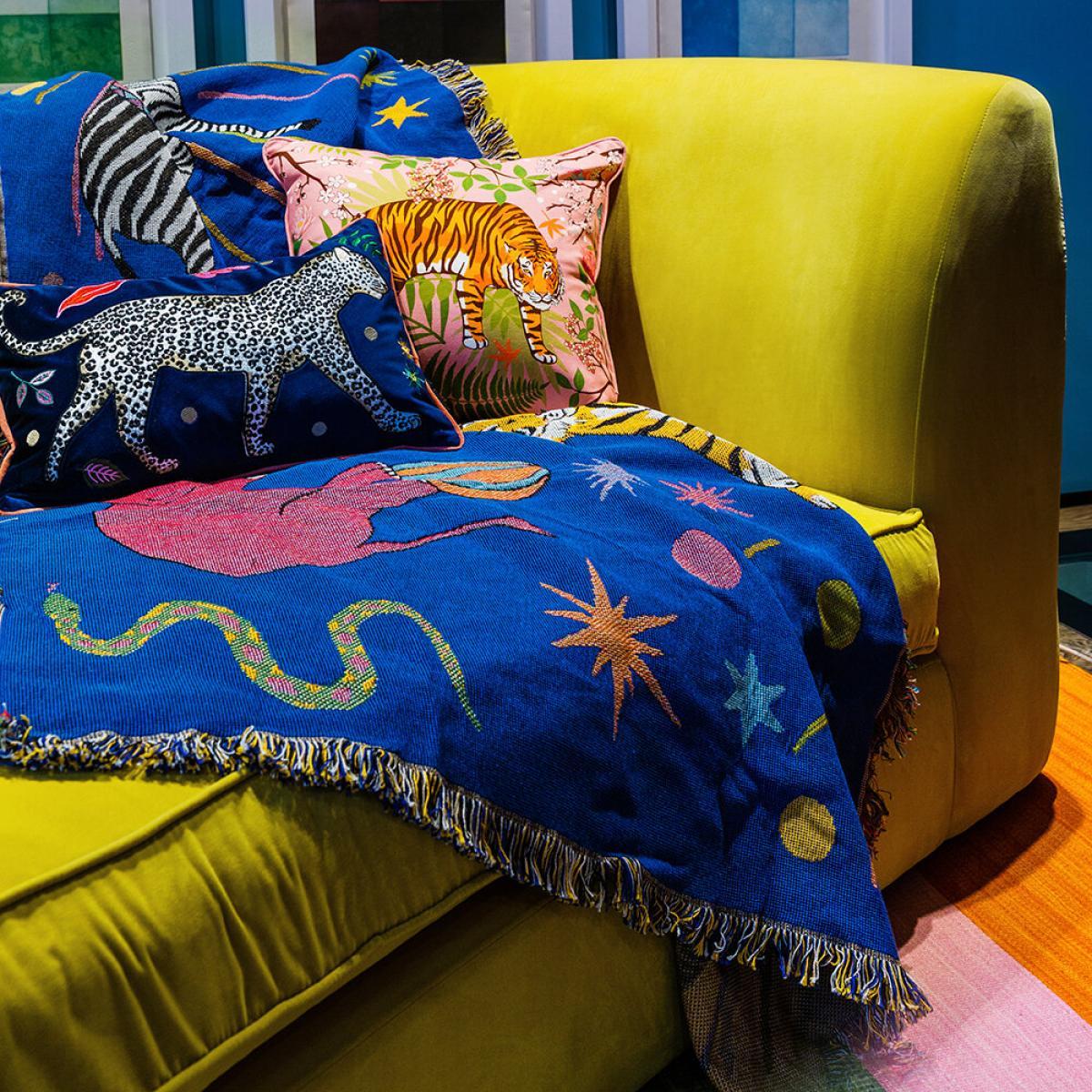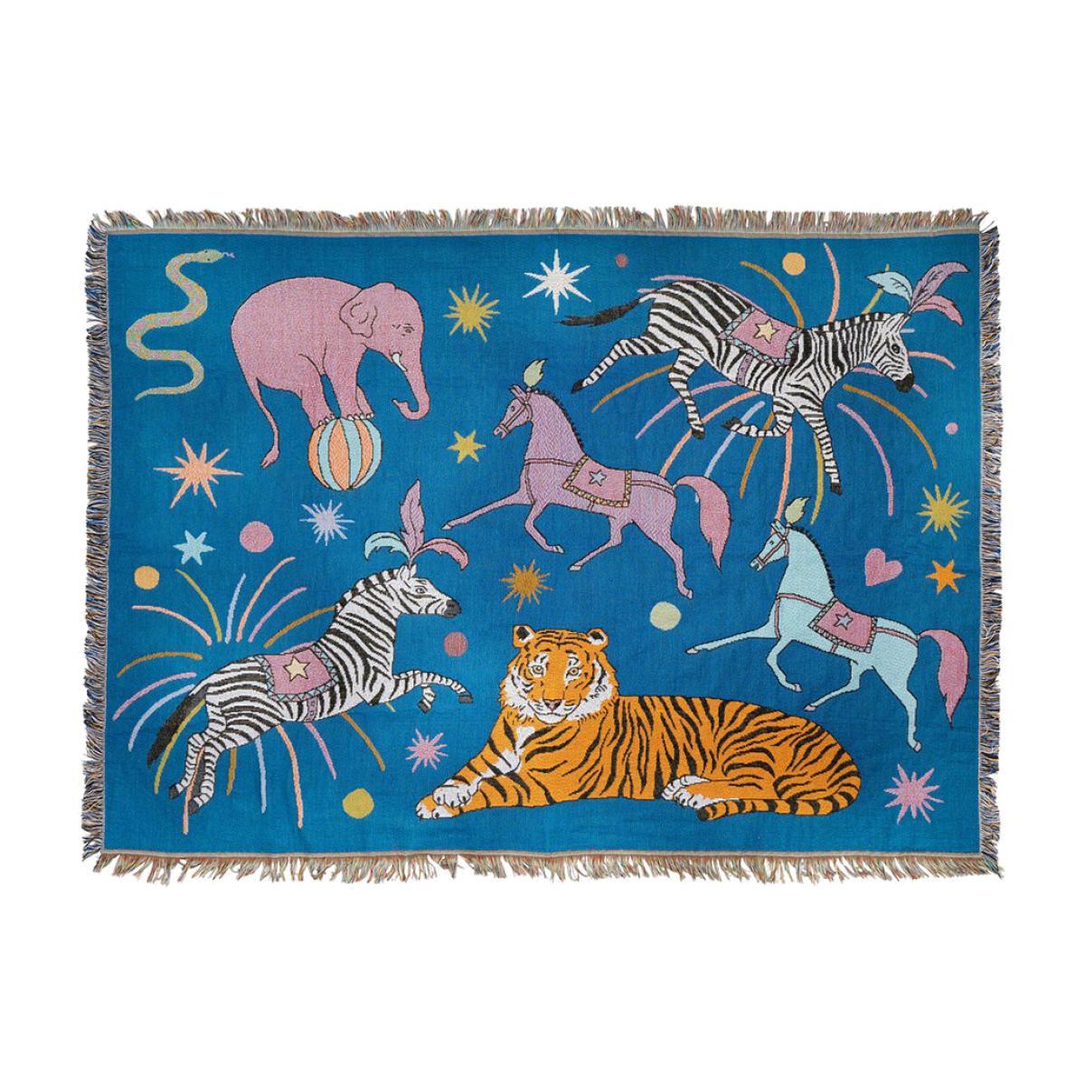 I love this circus throw for its playful, vibrant design that adds a fun, eclectic touch to any space. It's especially effective layered over a neutral sofa or bed to inject a pop of colour and a quirky personality. The bold pattern works well in interiors with a boho, eclectic, or whimsical vibe, but it can also add a lively contrast to more minimalist schemes. Practical styling tips include pairing it with textured cushions or a plain throw for a layered look, or using it in a kids’ room or creative nook to elevate the playful feel. Its size makes it versatile for draping over the end of a bed or folding neatly on a sofa for casual, easy glamour.