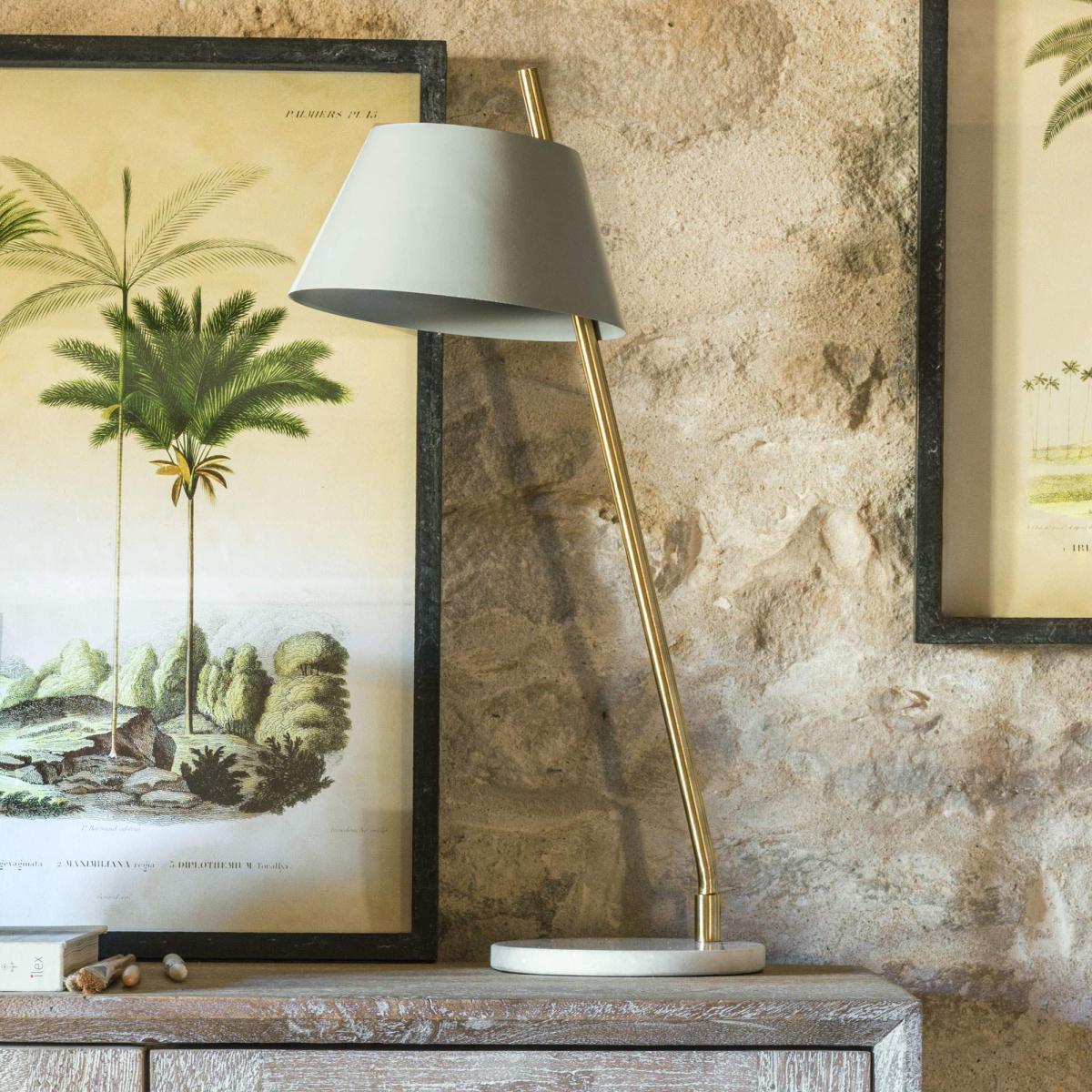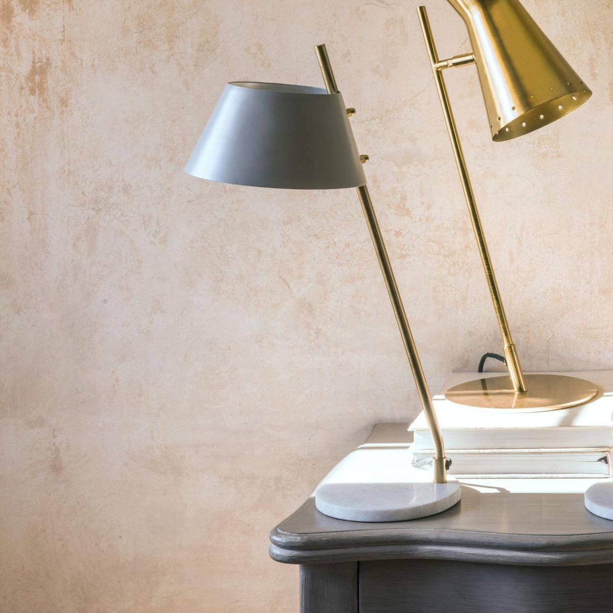 A retro-inspired table lamp made of iron with a brushed brass finish and round white marble base. Complete with a pebble grey shade.