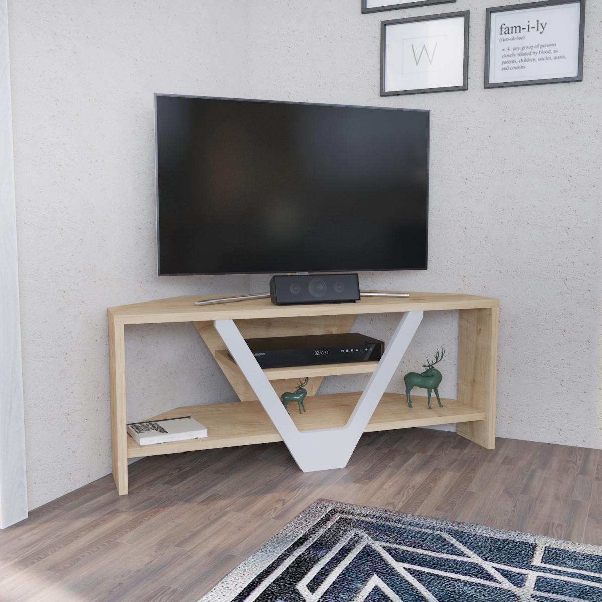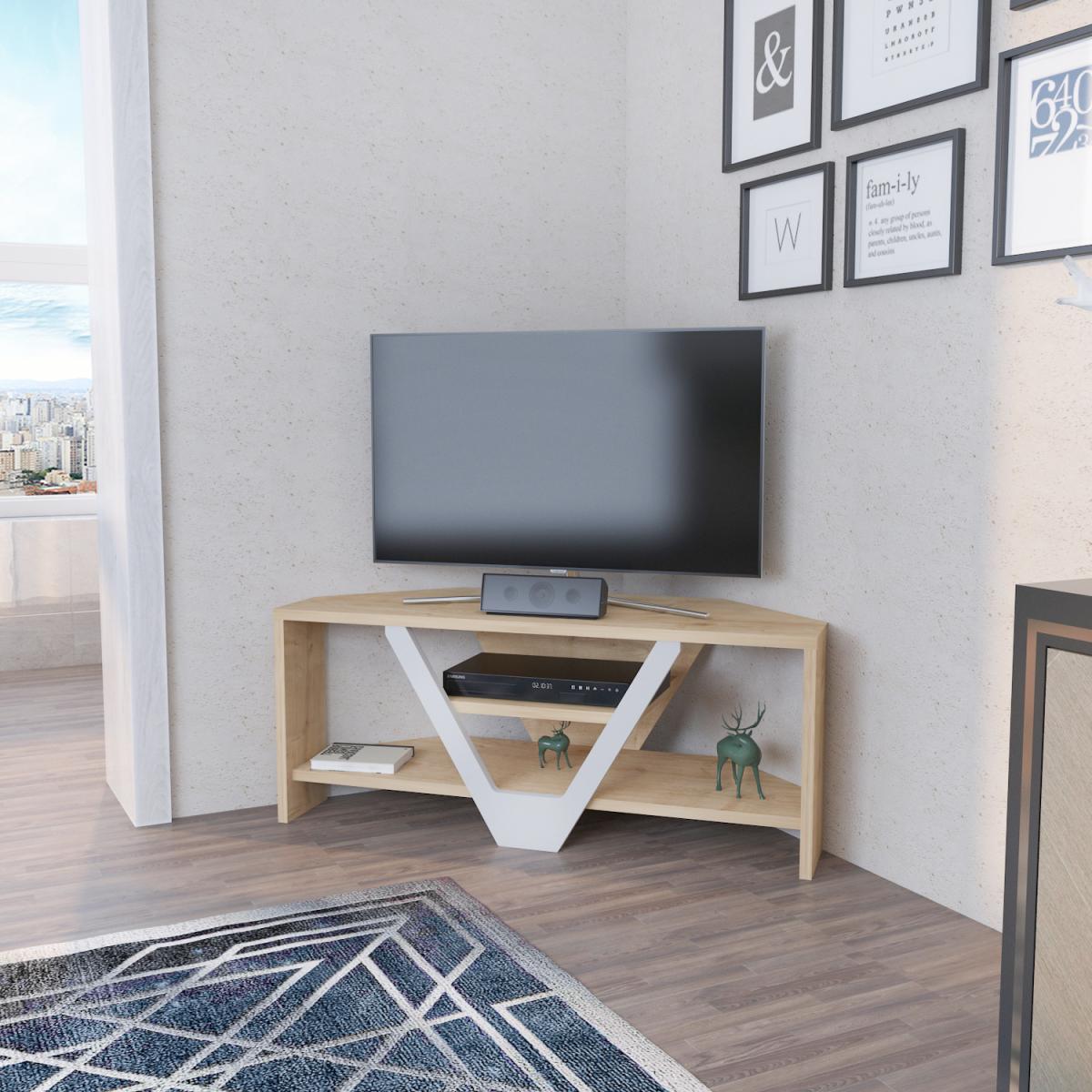 Karin 90 cm wide simple and minimalist media stand for TVs up to 40'' is defined by practical functionality and streamlined design. Shaped to nestle into any corner, this TV stand offers a touch of timeless, traditional appeal to any entertainment space. Top this design with a sleek flat-screen TV, then deck out the interior open shelves with your favorite books and DVDs, framed family photos, and hurricane candles, while using the middle shelf for your new video game console and the cable box. The media stand is made of 18 mm thick quality melamine coated particle board and banded with first-class PVC edge banding tape. The stand is also enhanced and strengthened with the front MDF leg which makes it sturdy and durable. It is manufactured using eco-friendly and health-friendly TSE-certified materials. The product will be delivered to the customer in the original package as disassembled. It is designed to be assembled by the customer easily using simple household tools like a power drill. Assembly instruction and installation hardware are included in the package. For fast and error-free installation, product parts are numbered with stickers in accordance with the assembly guide.