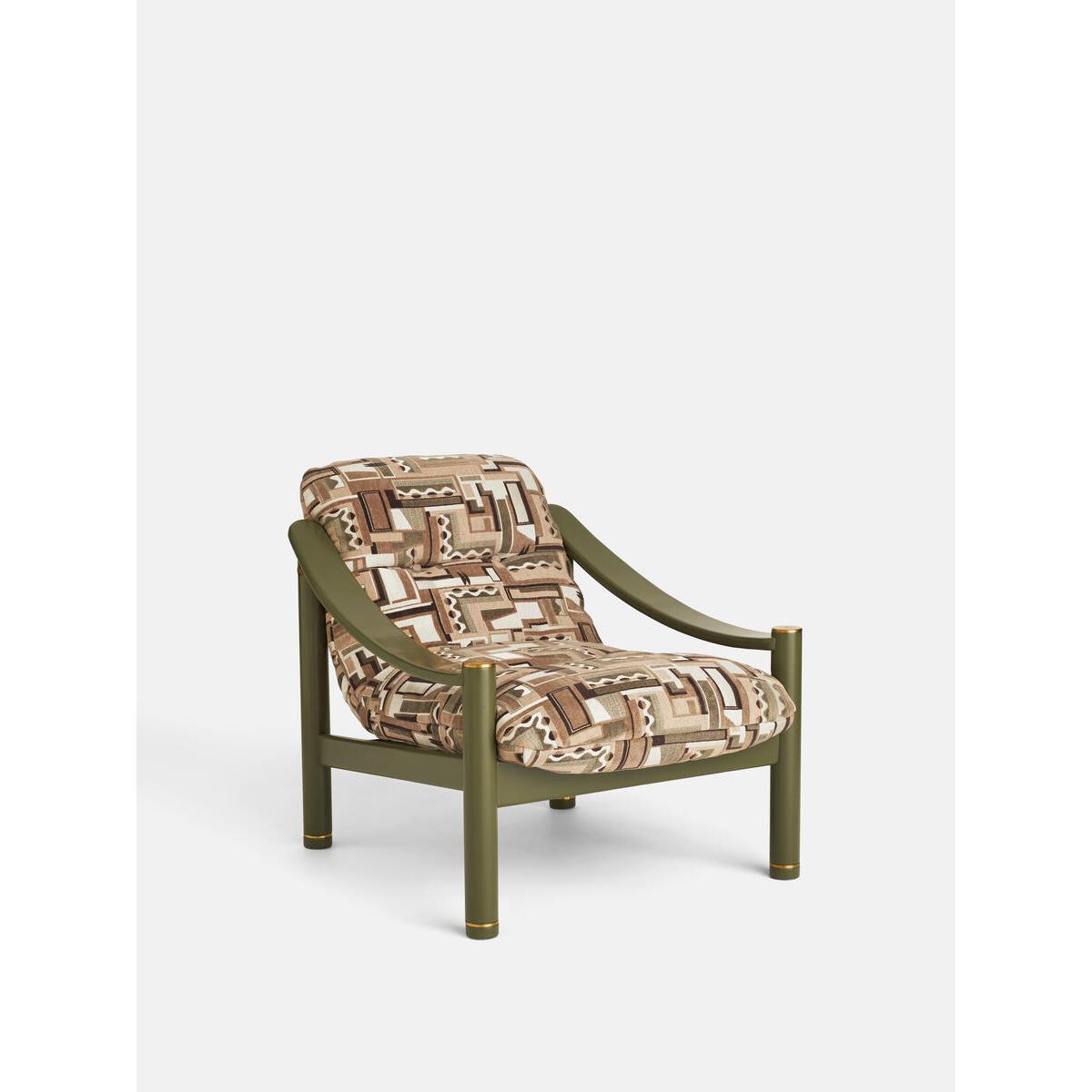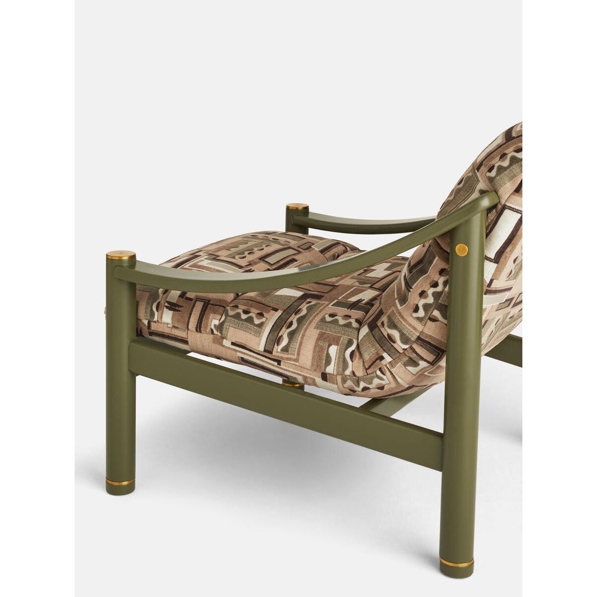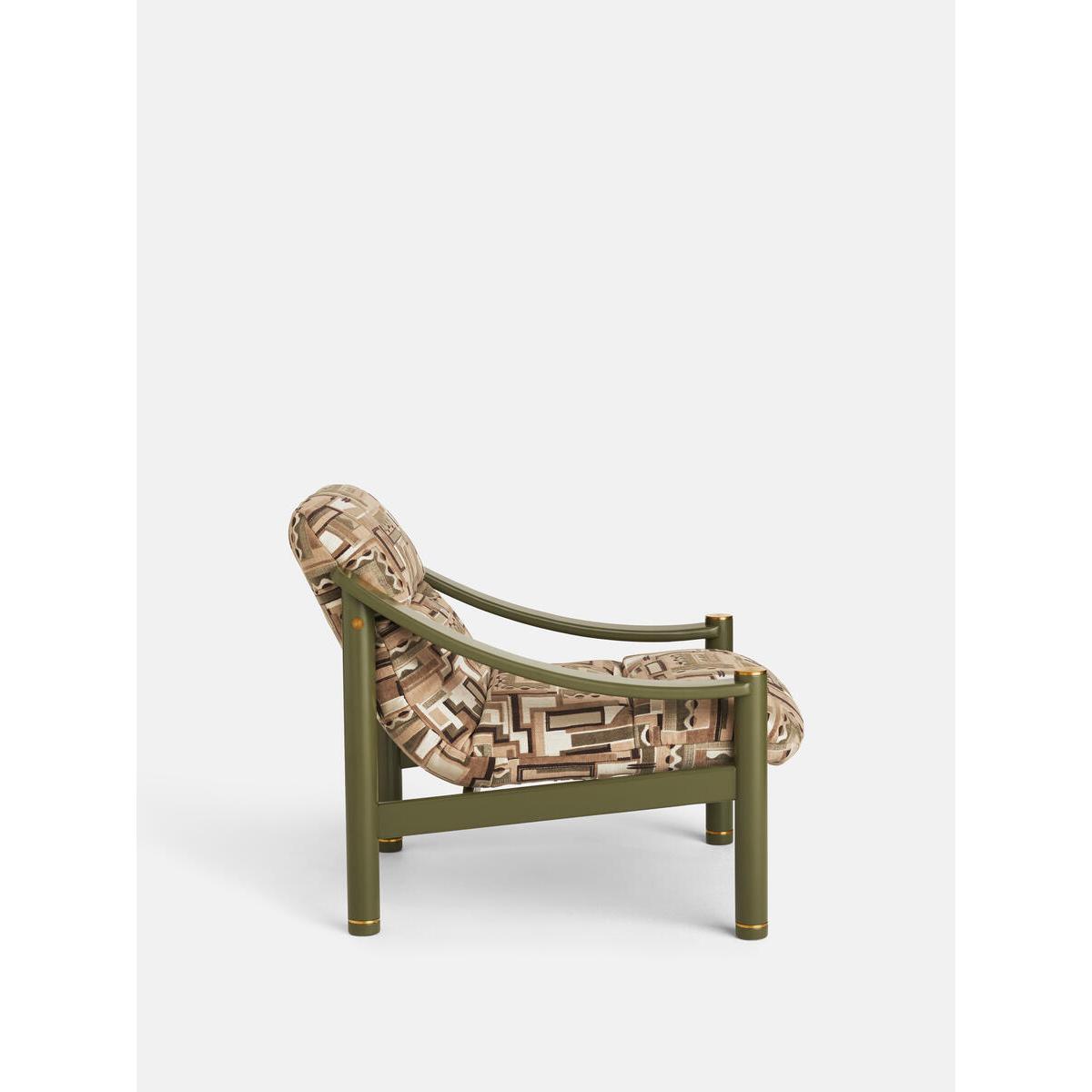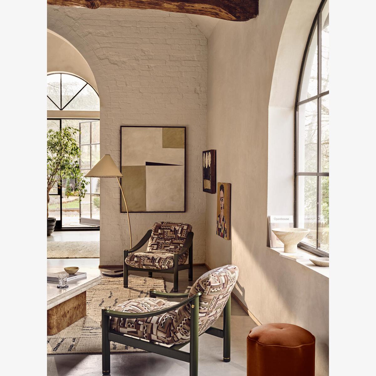 Our Karine armchair embodies the 1960s design aesthetic of White City House. A textured jacquard weave fabric designed in-house is playfully contrasted with a high-gloss lacquer frame in olive green. Brass details add to this vintage-inspired piece, while the laid-back seat ensures maximum comfort when it's time to relax and unwind with a nightcap. Vintage-inspired armchair Upholstered in textured jacquard weave fabric Designed in-house Pulled button detailing High-gloss lacquer frame Brass details Inspired by White City House