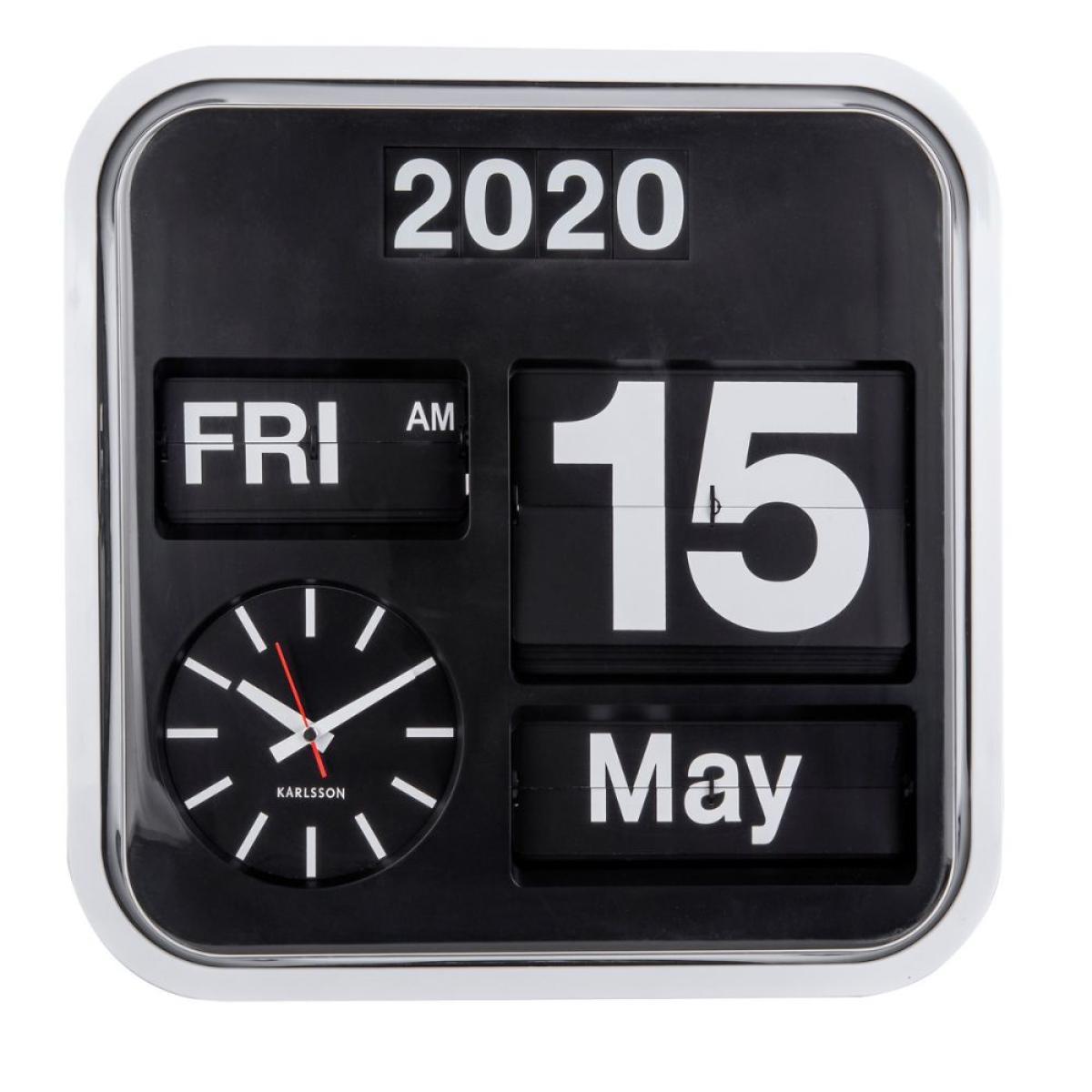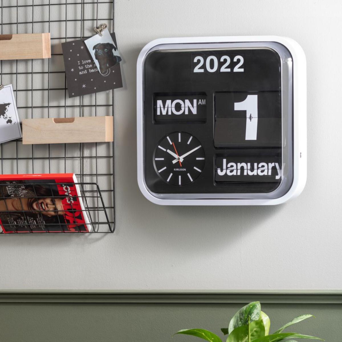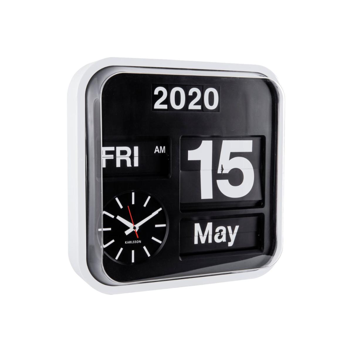 A classic from Karlsson. Wall clock Big Flip is a practical accessory, but also a stylish item on the wall. Big Flip from Karlsson gives you a complete overview with one glance. He is not only showing the time, also the day and date are shown. This Karlsson clock is very useful in business environments - in the office or in your home office - but the Big Flip wall clock also can get a spot in the kitchen or living room. The wall clock by Karlsson impresses with a retro look reminiscent of the 1950s. The simple white case with black dial makes it a modern decorative item on the wall. Dimensions: H:51 x W: 49 x D:21.5 cm Materials: PVCAssembly required: No Care Instructions: wipe clean with a soft lint free cloth