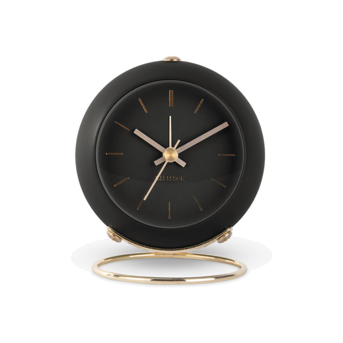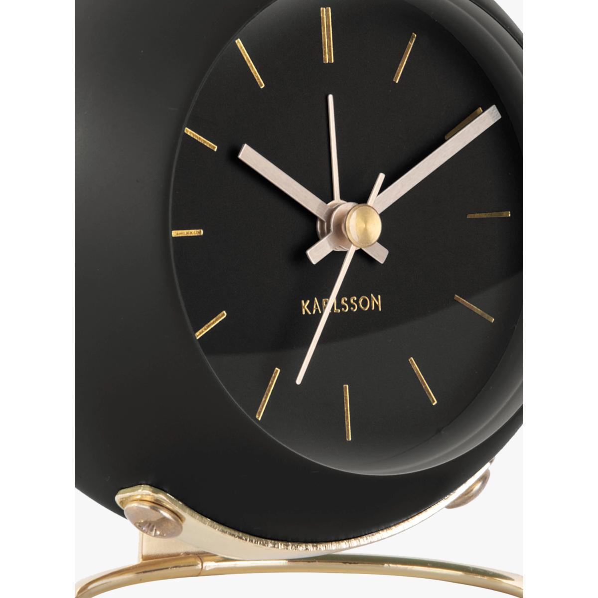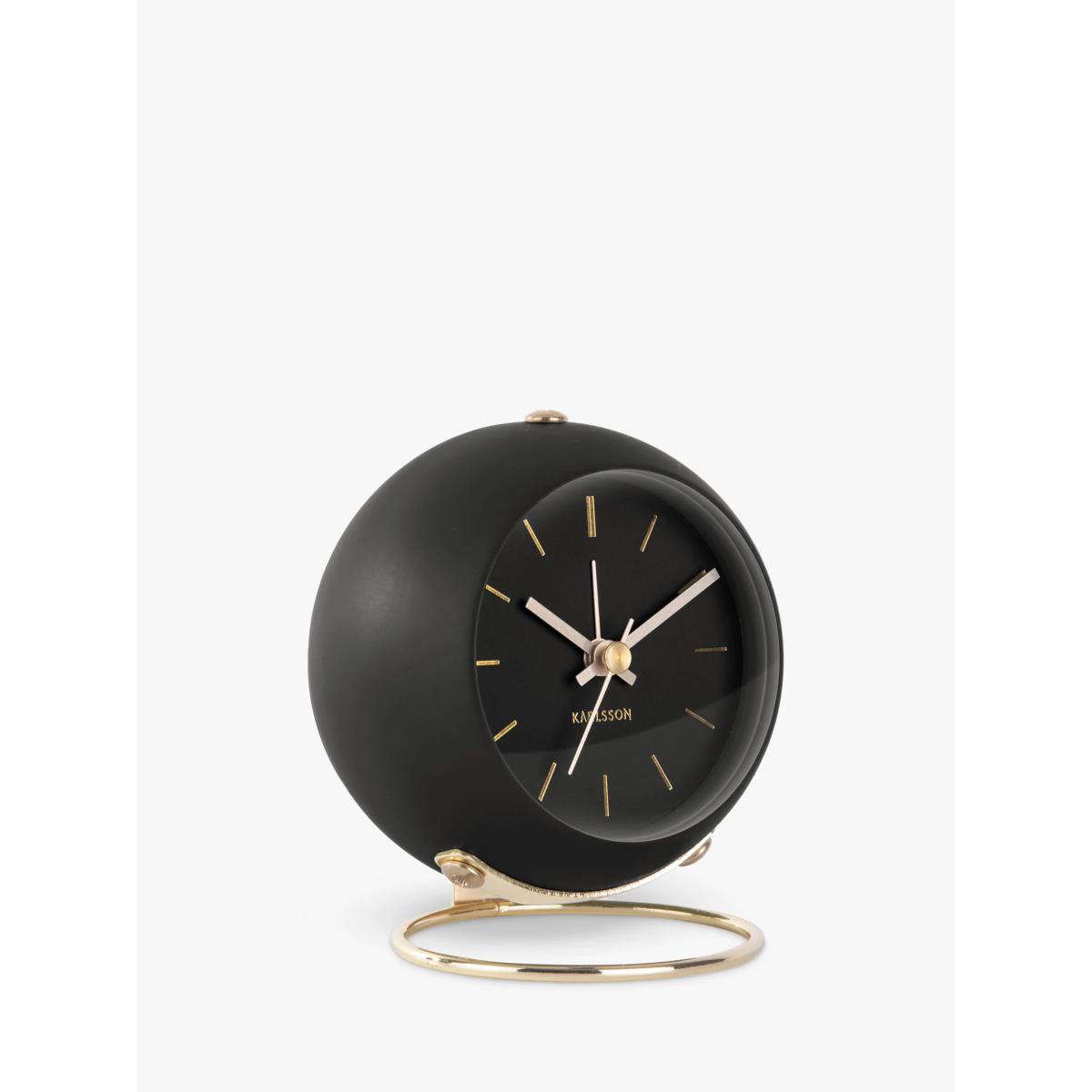 From the Globe series of clocks designed by Armando Breeveld for Karlsson, this alarm clock is a contemporary design with golden detailing, matching the ringed base. The rounded metal casing finishes with a globed glass face, creating a luxurious, modern feel. The compact size is ideal for a bedside table or home office desk.
