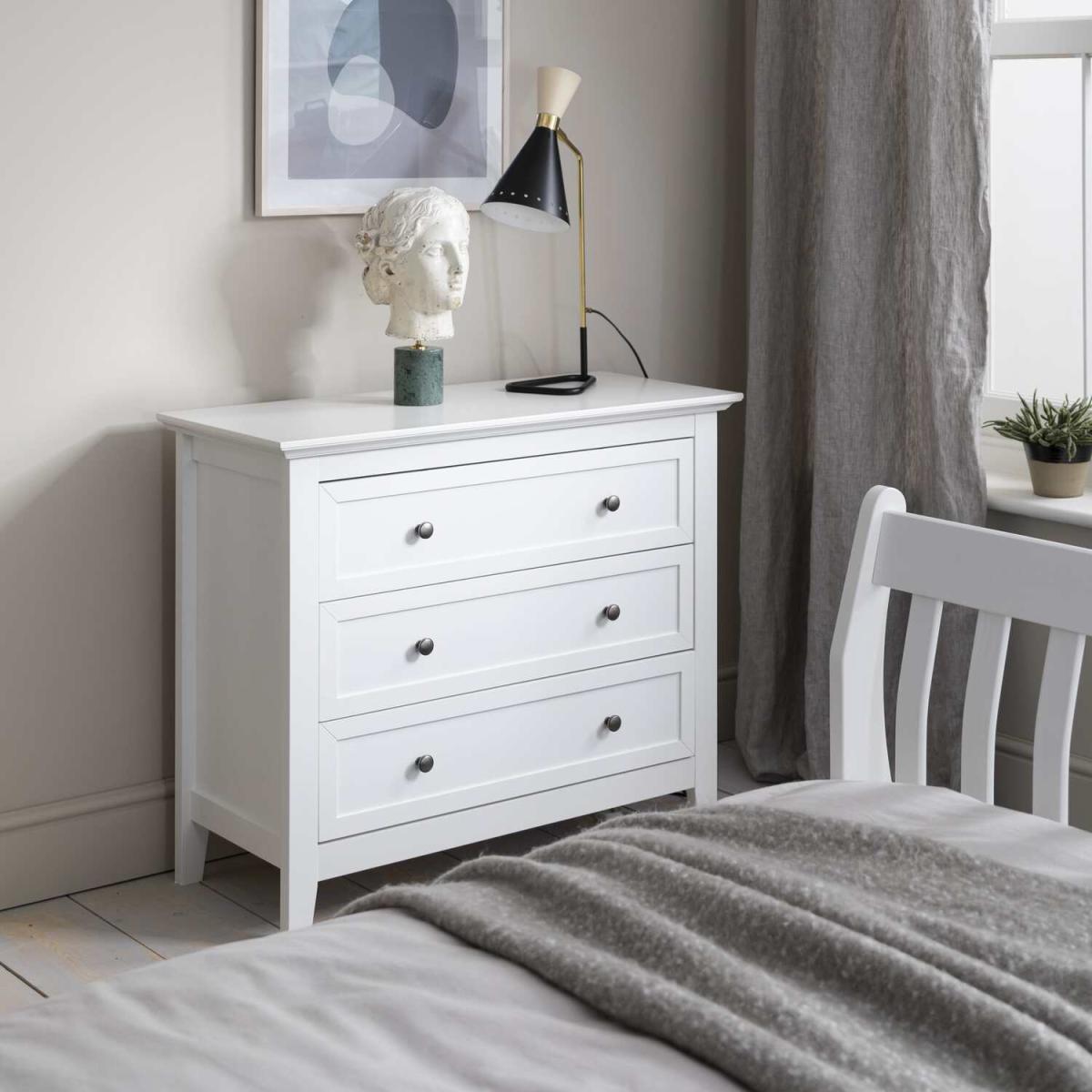 Choose Karlstad for a sophisticated and spacious solution for all your storage needs. This chic, 5-drawer chest beautifully accommodates all your bedroom essentials, such as jersey tops, underwear, socks and accessories. Crafted from solid pine (with MDF Components) and finished in a refreshing white, Karlstad is the epitome of modern simplicity. Chic and unassuming, the piece creates a minimal and serene vibe for contemporary bedrooms. Team with a luscious green plant and natural accessories for an on-trend tranquil vibe. Also available in a slightly shorter, 4-drawer design.