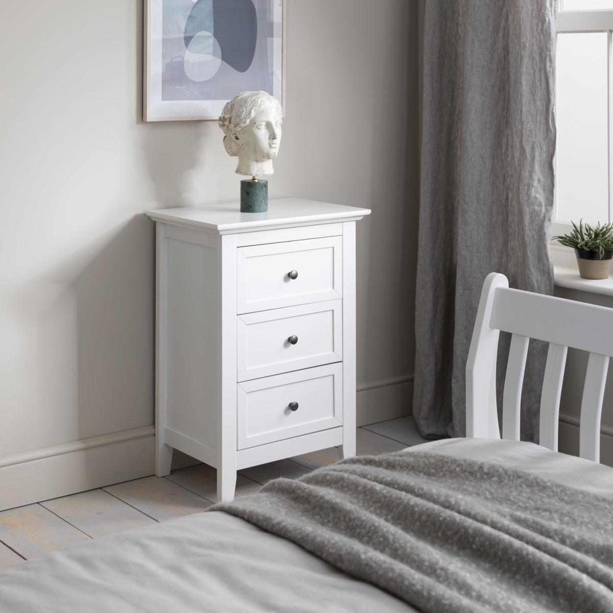 Timeless, classic and chic, the Karlstad 3 Drawer Chest is an essential bedroom piece. Its petite style allows it to double up as chic bedside table, whilst the three drawers are handy for storing books, notepads, undergarments or accessories. Finished in a fresh white shade, Karlstad is understated and elegant. A statement lamp offers the perfect accoutrement to the simple piece. Team with matching pieces from our Bertel collection to create a beautifully classic boudoir with a modern twist.
