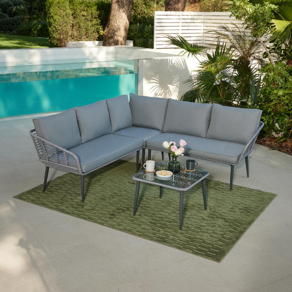 Introducing our beautiful wicker style Karnak corner garden sofa set. Upgrade your outdoor space with this gorgeous steel framed rattan corner set. The Karnak garden set has been designed with a gorgeous wicker style back design. Comes with a corner sofa and a glass topped coffee table. We recommend that you use the provided garden furniture cover when not in use, and bring your cushions indoors for longevity. This garden set is a large item, therefore we require you to ensure it will fit through any access doors and walkways up to and within around your property. Minimum door width of 80cm. All sizes are approximate, please allow for small variations.