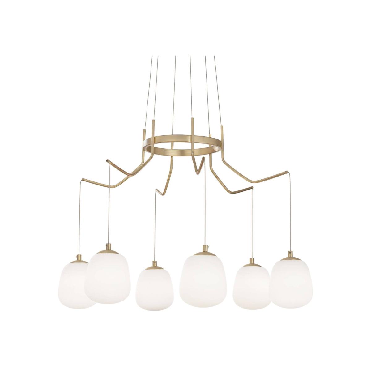 This fitting is sure to add a positive feel to any setting. The satin brass arms branch outwards and in a circular fashion, providing a wide light spread which will spread in all directions throughout the room. The acid-etched blown glass diffusers add further to this effect, as the light can shine through them from all sides. The fitting is available in six and ten light versions. LED G9 3.2W lamps included with the fittings. Class one.