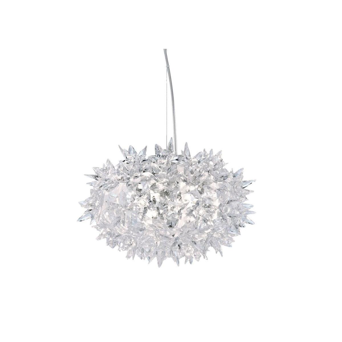 A glistening display of modern form, the Bloom pendant mixes an inventive use of materials with all the complexity of a unique hand crafted piece. A complex structure of polycarbonate flowers produces the bulbous silhouette of this spectacular pendant, with intricate levels of detail imitating cut glass crystal.