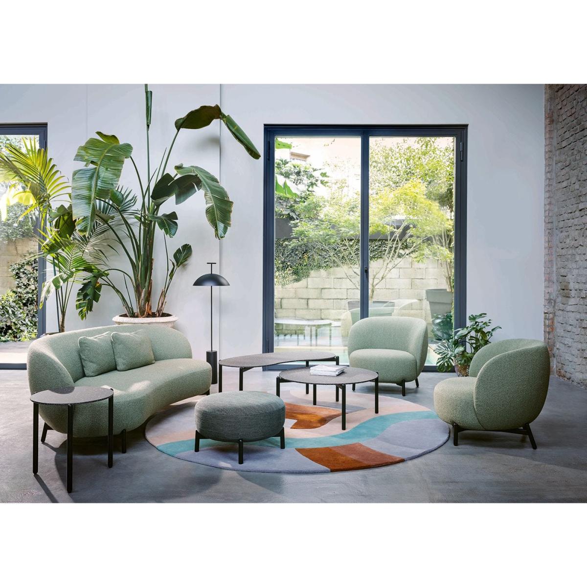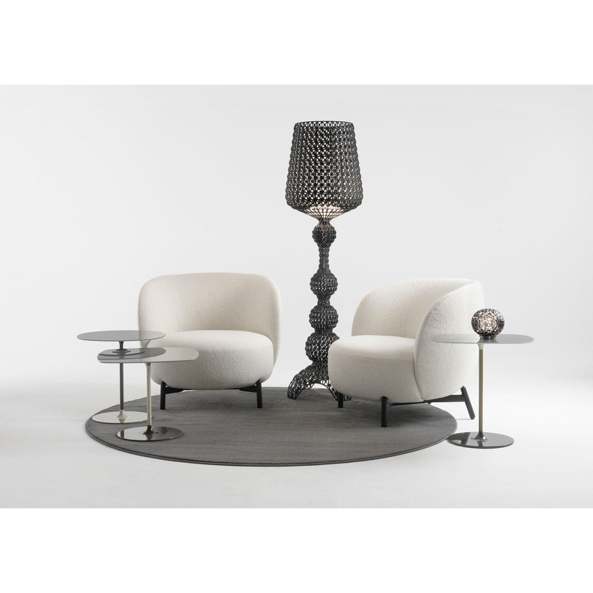 Lunam is an enchanting living space furniture collection inspired by the dreamy atmosphere of a lunar landscape, designed by Patricia Urquiola for Kartell. An essential, painted metal structure supports generously dimensioned upholstered sections. Sofa, armchair and pouffe come in soft bouclé fabric.