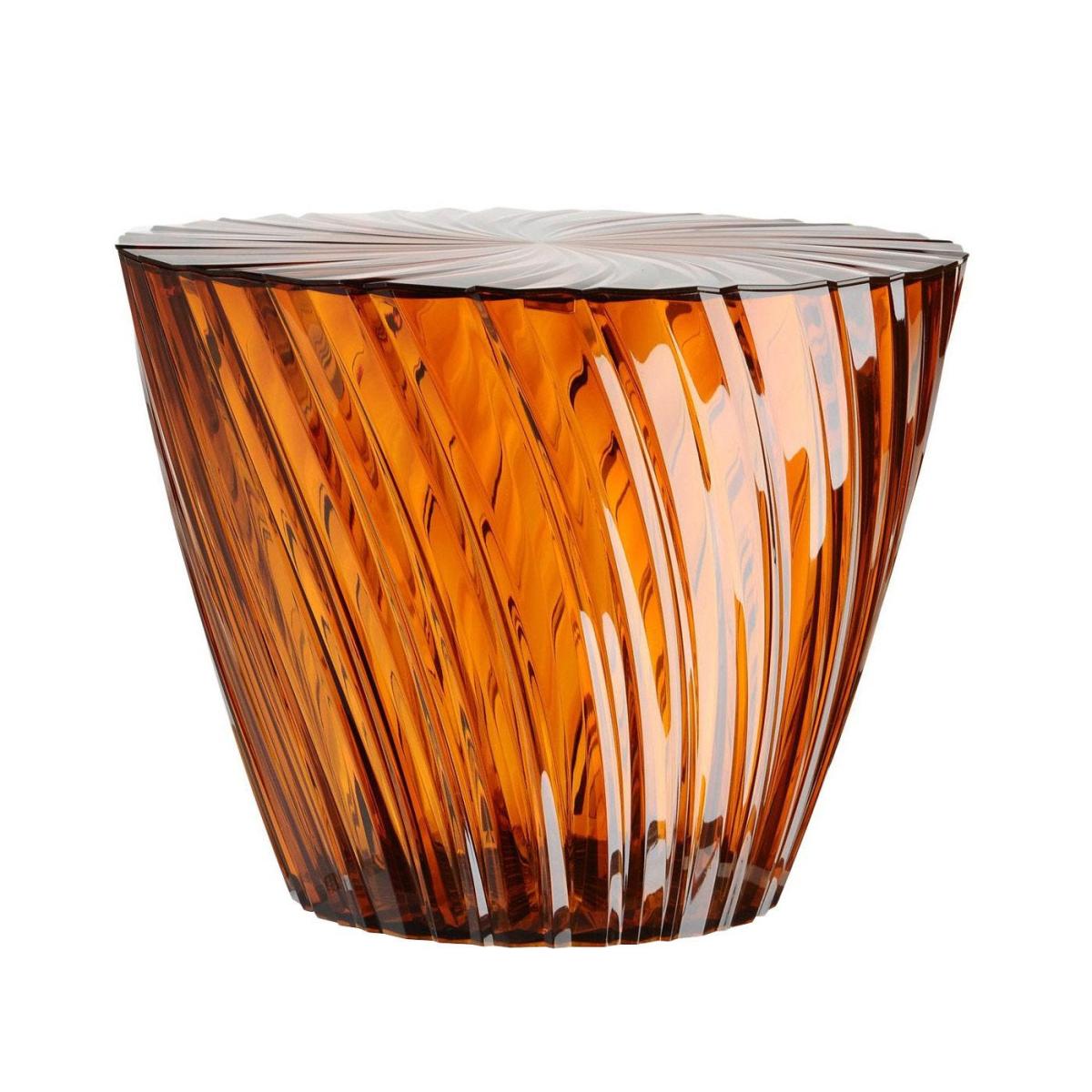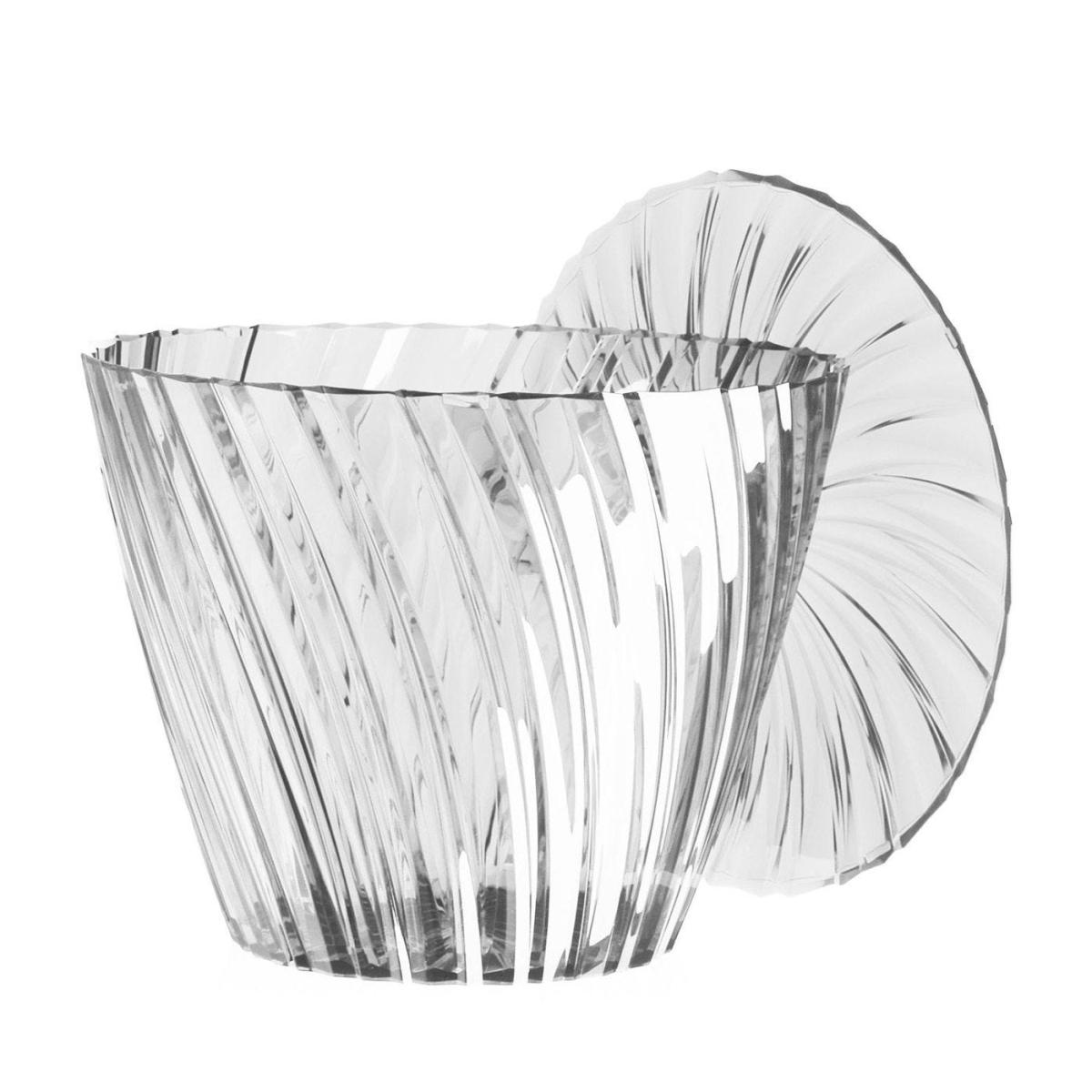 The beautiful textures and refractions of cut glass crystal have long been a feature of decorative objets. Using innovative injection moulded plastic Tokyjin Yoshioka has recreated this dazzling effect on the Sparkle, a transparent table and storage unit formed into a pleated relief of swirling pattern.