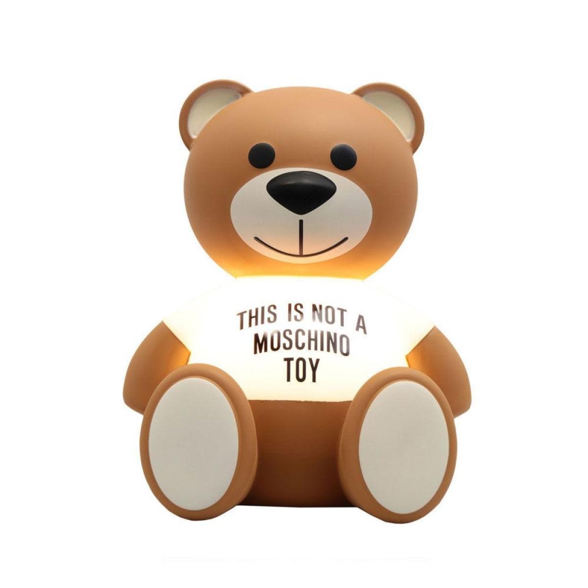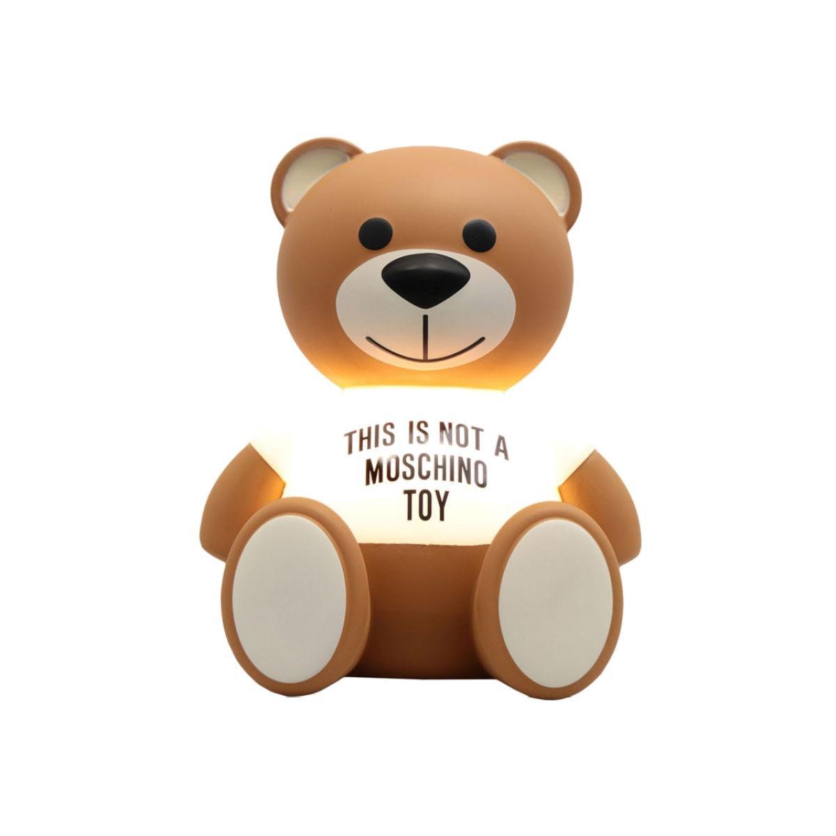 Jeremy Scott reinvents Moschino's iconic teddy bear emblem in this unique Kartell table lamp. Assuming the shape of the iconic small bear, this playful piece is emblazoned at the chest with an irrevent logo to remind onlookers that this is not just another Moschino toy.