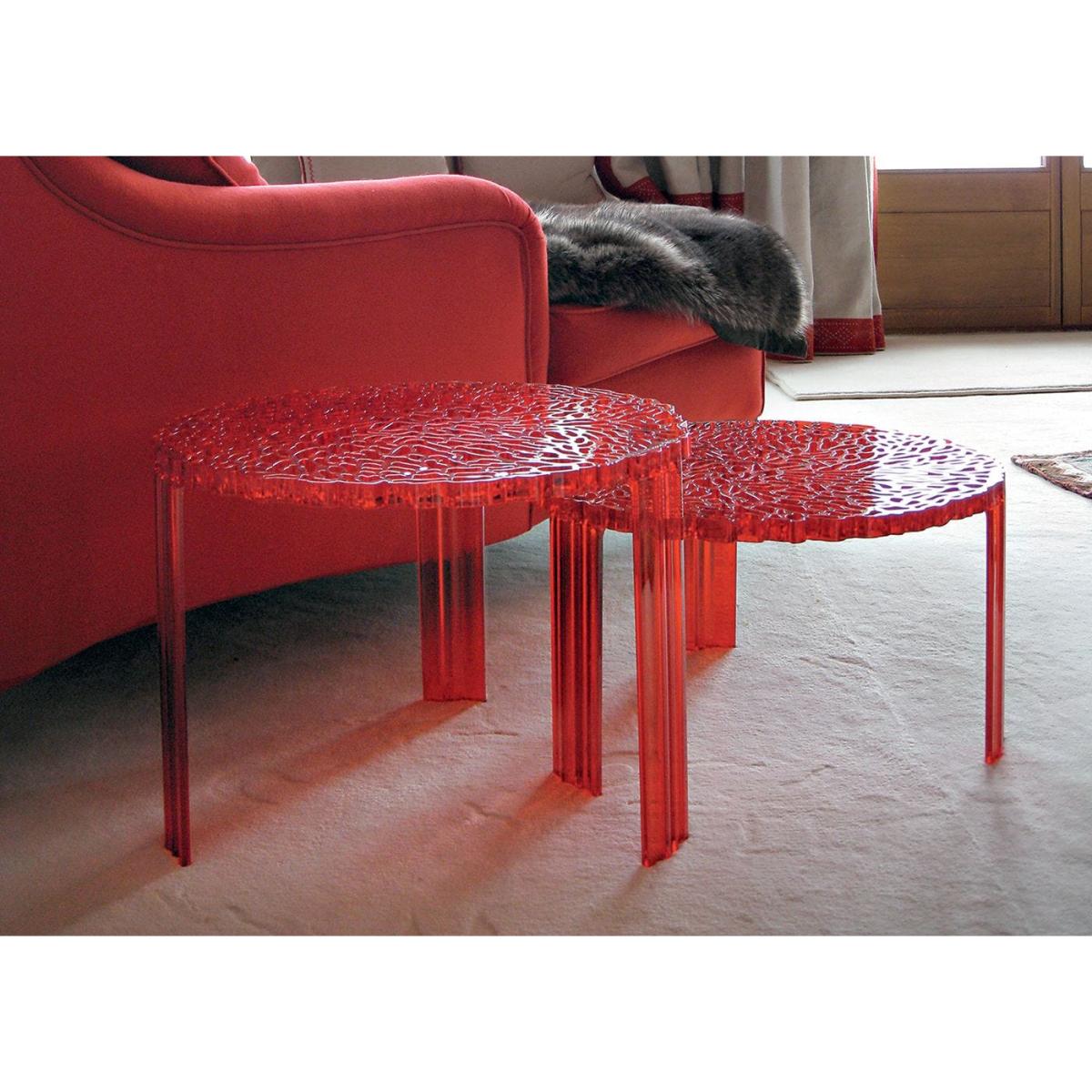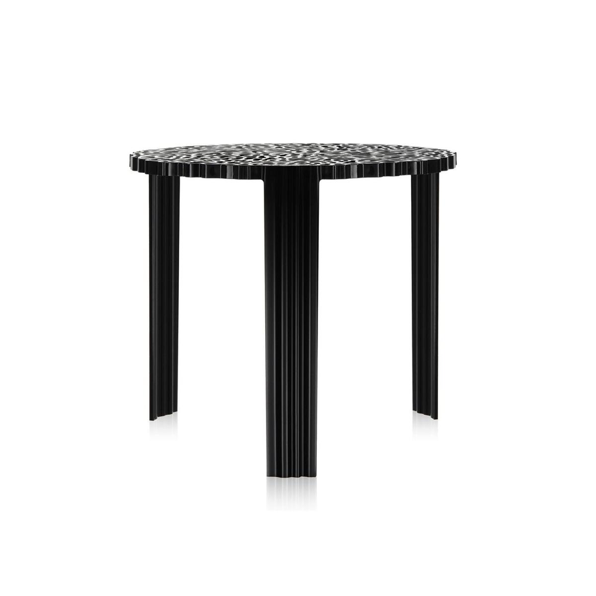 A line of tables in three heights, designed by Patricia Urquiola for Kartell. The surface of the T-table top alternates fullness and space to create an elegant and precious effect which is reminiscent of embroidery.