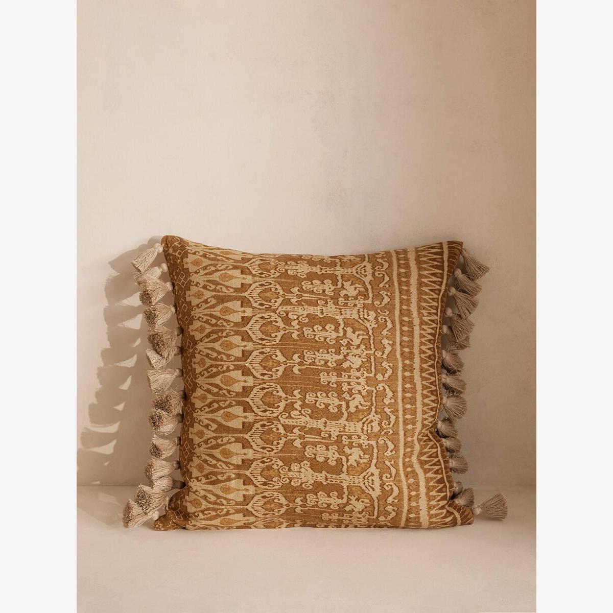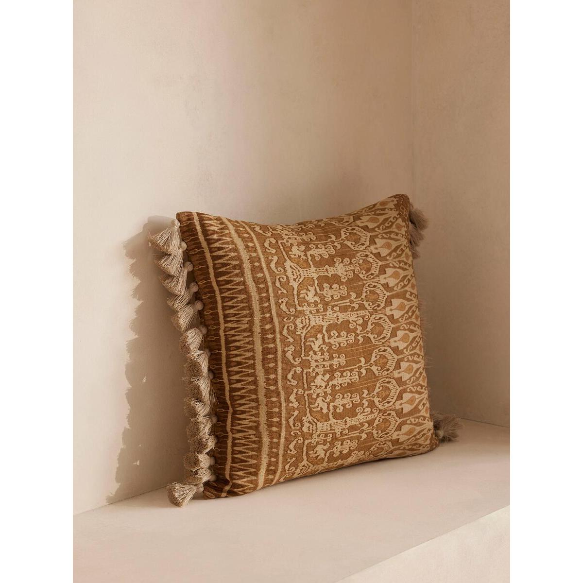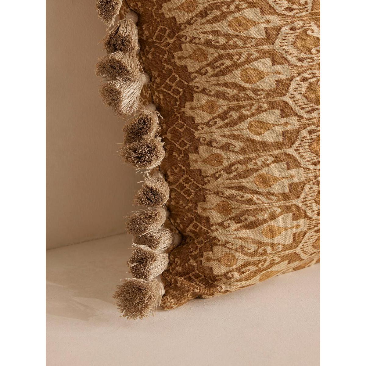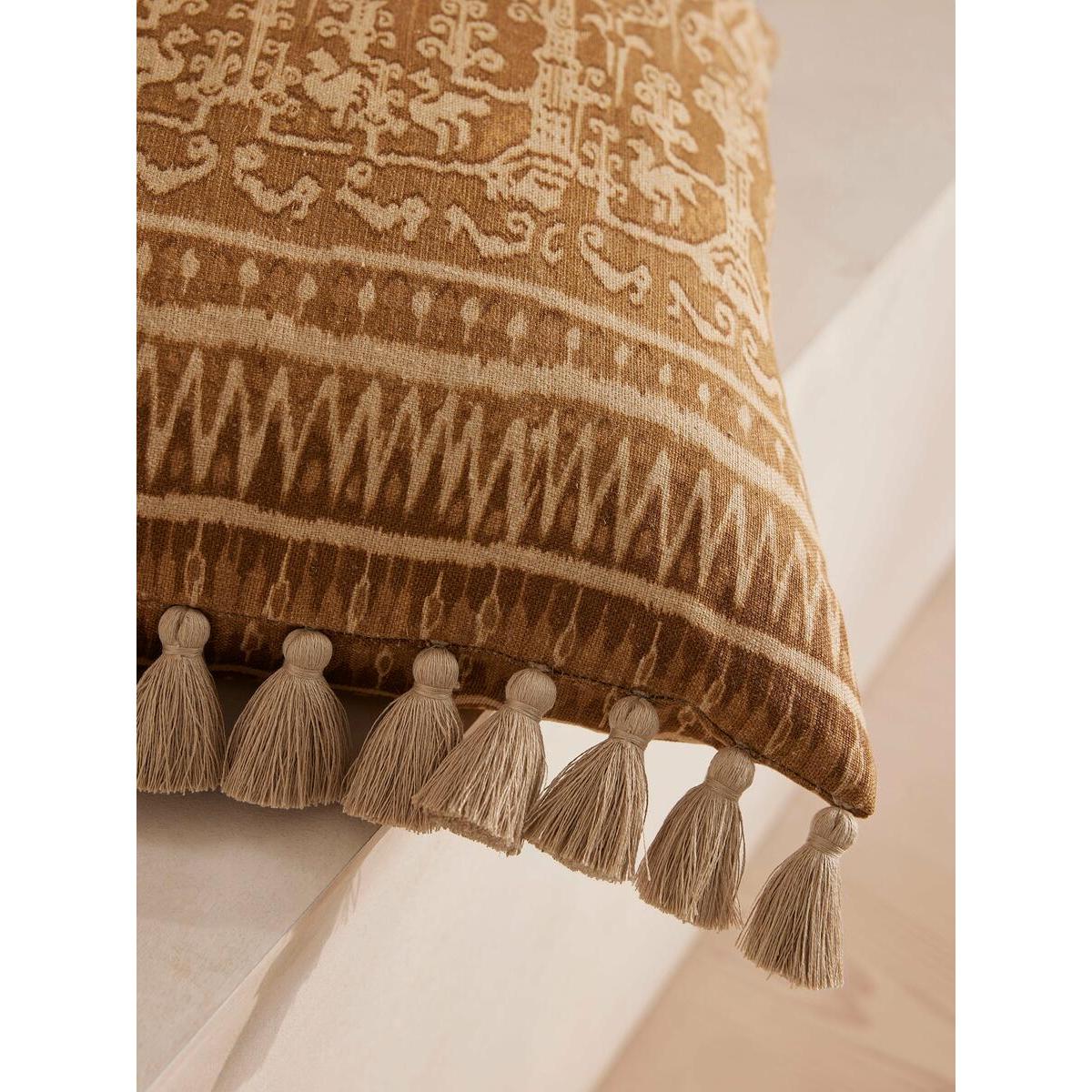 Our double-sided Kartika cushion is inspired by similar styles seen in Soho Farmhouse, with the pattern and soft colour palette reminiscent of natural dyes used on antique Ikat fabrics for a lived-in look. Digitally printed in Italy on linen, it's detailed with olive tassels for a decorative finish. Mix with other Ikats from our textiles collection. Double-sided Ikat print Designed in-house Linen fabric Digitally printed in Italy Tassel trims Made in the UK Inspired by Soho Farmhouse