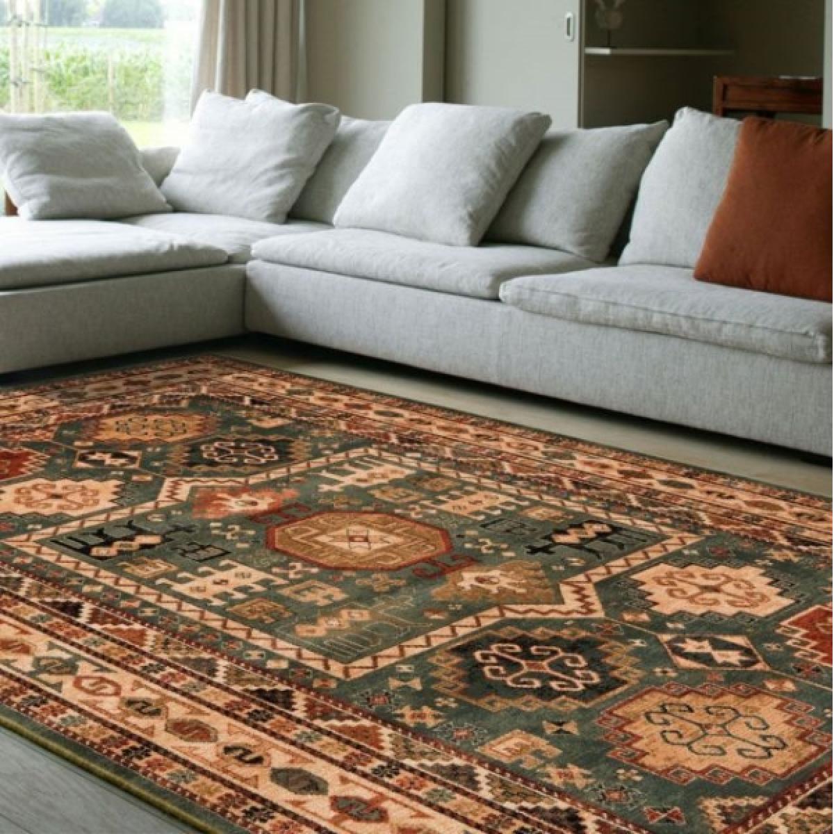 A green, power loomed traditional rug that is full of oriental and tribal patterns. This Kashqai Rug is highly detailed with a selection of pastel colours that will complement any room in your home. It is made with a luxurious, 100% wool pile, thus making it soft and homely.