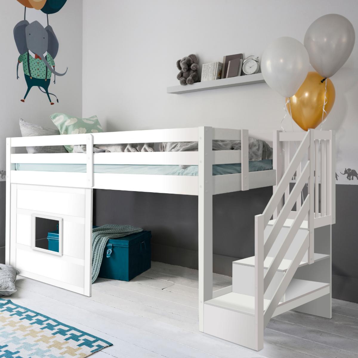 Whos excited for bedtime? We are! Kids love climbing up Kasjas steps to sleep among the stars. This fun cabin bed is full of space and cool features, letting your little ones imagination run wild. Crafted from solid pine, Kasja is both stylish and sturdy. The easy access stairway is great for kids who find ladders tricky and there is built-in shelving under the steps too! Perfect for storing storybooks or displaying favourite cuddly toys. Overall: Length (Including Staircase) 243.5cm x Depth 96cm x Height 127cm Clearance to Underside of the Bed: Approximately 91.5cm Length of Bed without staircase: 196cm